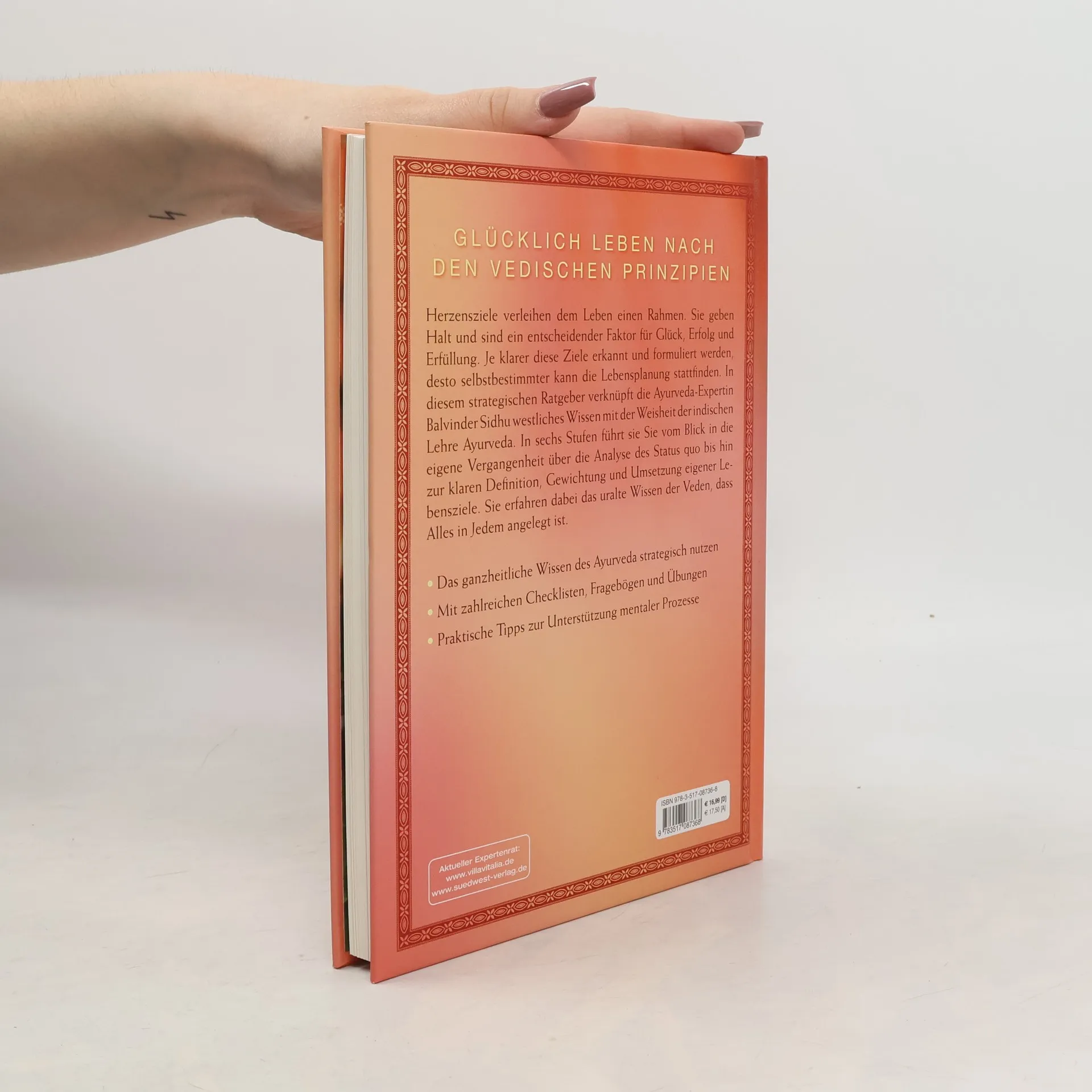 Herzensziele geben dem Leben einen Rahmen Sie geben Halt und sind ein entscheidender Faktor für Glück, Erfolg und Erfüllung. Je klarer diese Ziele erkannt und formuliert werden, desto selbstbestimmter kann eine persönliche und berufliche Lebensplanung stattfinden. In diesem Ratgeber verknüpft die Ayurveda-Expertin Balvinder Sidhu das westliche Managementwissen mit der Weisheit des indischen Ayurveda. Die Autorin führt den Leser in sechs Stufen vom Blick in die eigene Vergangenheit über die Analyse des Status quo bis hin zur klaren Definition, Gewichtung und Umsetzung eigener Lebensziele. Sie vermittelt dabei das uralte Wissen der Veden, dass Alles in Jedem angelegt ist. Mittels Fragebögen, ayurvedischen Rezepten und Tipps sowie kleinen Übungen wird der Leser animiert, aktiv etwas für sein Glück zu tun. Denn jeder trägt das gesamte Potenzial zur selbstbestimmten Lebens(um-)gestaltung in sich.