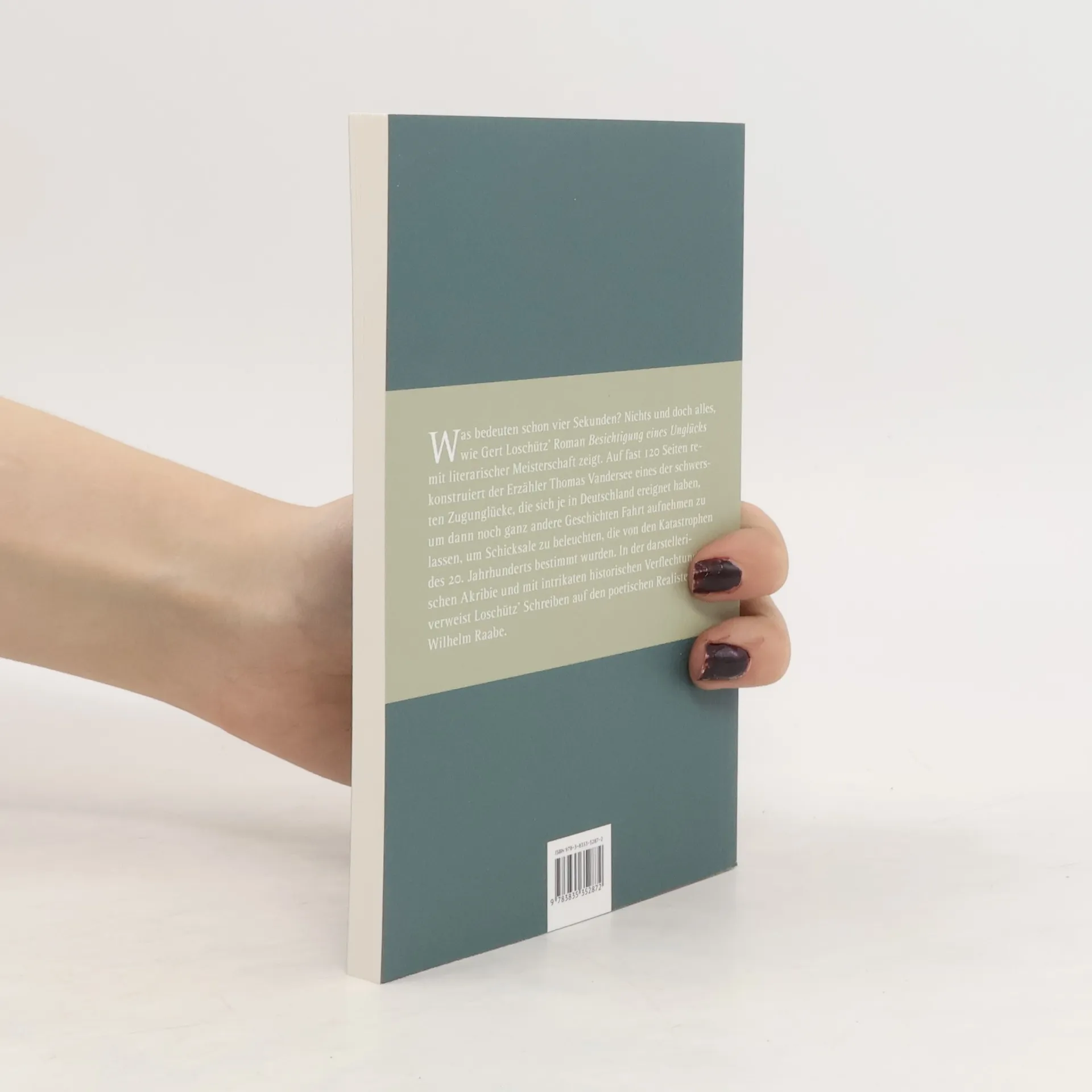 Reden und Essays zu Wilhelm Raabe und Gert Loschütz, der 2021 den Wilhelm Raabe-Literaturpreis für »Besichtigung eines Unglücks« erhielt. Was bedeuten schon vier Sekunden? Nichts und doch alles, wie Gert Loschütz‘ Roman »Besichtigung eines Unglücks« mit literarischer Meisterschaft zeigt. Auf fast 120 Seiten rekonstruiert der Erzähler Thomas Vandersee eines der schwersten Zugunglücke, die sich je in Deutschland ereignet haben, um dann noch ganz andere Geschichten Fahrt aufnehmen zu lassen, um Schicksale zu beleuchten, die von den Katastrophen des 20. Jahrhunderts bestimmt wurden. In der darstellerischen Akribie und mit intrikaten historischen Verflechtungen verweist Loschütz‘ Schreiben auf den poetischen Realisten Wilhelm Raabe. Mit Beiträgen von: Hans Christoph Buch, Katrin Hillgruber, Jochen Hörisch, Gert Loschütz, Michael Schmitt und Hubert Winkels