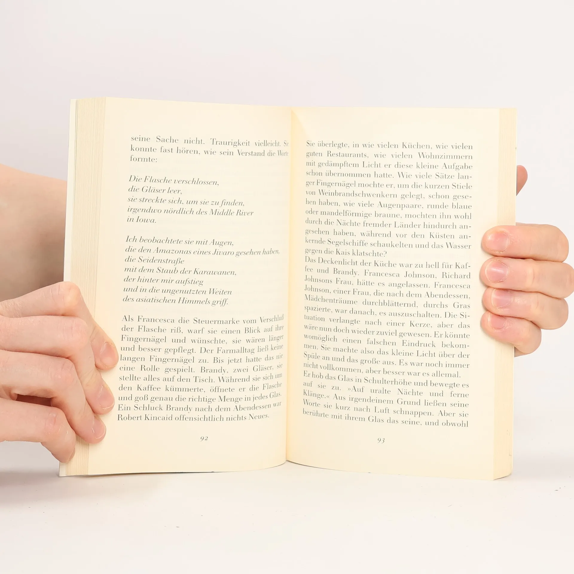 In seinem Romandebüt beschreibt der amerikanische Schriftsteller eine intensive, aber aussichtslose Liebesaffäre: Der Fotograf Kincaid, 52 Jahre alt, hat die ganze Welt gesehen. Mutig genug, lässt er sich auf die verheiratete Farmersfrau Francesca ein.