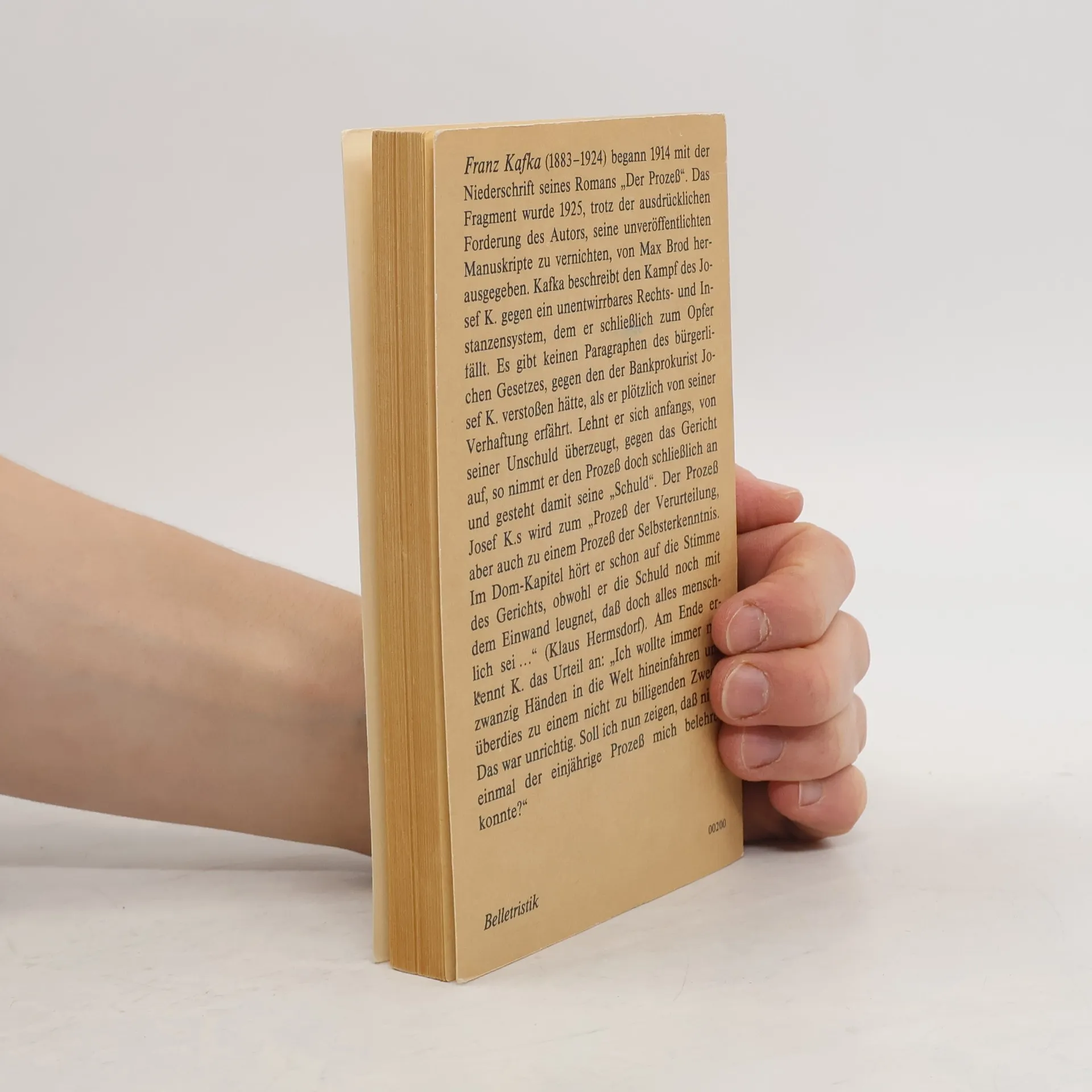 „Jemand musste Josef K. verleumdet haben, denn ohne dass er etwas Böses getan hätte, wurde er eines Morgens verhaftet“ - damit beginnt der im Januar 1915 fertiggestellte Roman (hier in wissenschaftlich einwandfreier Ausgabe), der in typisch kafkaesker Weise den Sinn eines Einzelschicksals mit der Sinnlosigkeit des Daseins zu verknüpfen sucht. Josef K., dessen eigenes Verhalten Rätsel aufgibt, verstrickt sich in die hohle Form einer Gerichtsadministration, deren Rechtsgrundlagen nebulös bleiben. Auch Josef K. s Vorstellungen von Recht und Gesetz erscheinen so abwegig, dass seine schließliche Exekution den erlösenden Schlusspunkt unter das Scheitern eines Individuums setzt, das es nicht geschafft hat, sich vom vorausgesetzten Vorwurf einer generellen Schuld zu befreien. Kafka selbst fühlte sich Zeit seines Lebens von zwanghaften Schuldgefühlen verfolgt, die vor allem seine Beziehungen zu Frauen vergifteten.