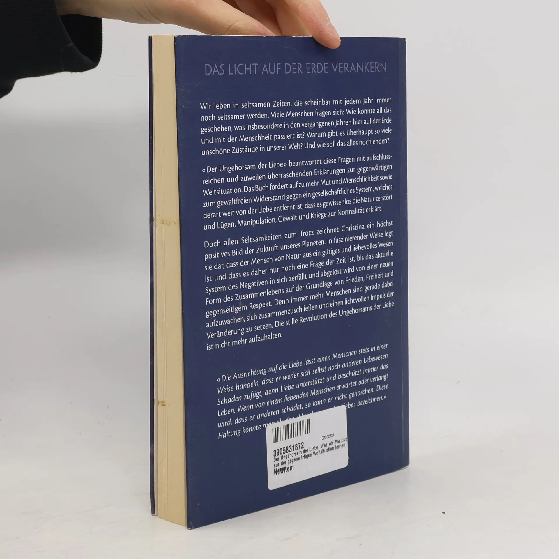 Wir leben in seltsamen Zeiten, die mit jedem Jahr noch merkwürdiger erscheinen. Viele Menschen fragen sich, wie es zu den jüngsten Entwicklungen auf der Erde und in der Menschheit kommen konnte. Das Buch bietet aufschlussreiche und überraschende Erklärungen zur gegenwärtigen Weltsituation und fordert mehr Mut und Menschlichkeit sowie gewaltfreien Widerstand gegen ein System, das weit von der Liebe entfernt ist und die Zerstörung der Natur sowie Lügen, Manipulation, Gewalt und Kriege zur Norm erklärt. Trotz dieser Herausforderungen wird ein positives Bild der Zukunft gezeichnet. Es wird dargelegt, dass der Mensch von Natur aus gütig und liebevoll ist, und dass es nur eine Frage der Zeit ist, bis das gegenwärtige negative System zerfällt und durch eine neue Form des Zusammenlebens auf Frieden, Freiheit und gegenseitigem Respekt basiert wird. Immer mehr Menschen erwachen, schließen sich zusammen und setzen einen lichtvollen Impuls der Veränderung in Gang. Die stille Revolution des Ungehorsams der Liebe ist nicht mehr aufzuhalten. Ein liebender Mensch handelt so, dass er weder sich selbst noch anderen schadet, denn Liebe unterstützt und schützt das Leben. Wenn von ihm verlangt wird, anderen zu schaden, kann er nicht gehorchen – dies ist der 'Ungehorsam der Liebe'.