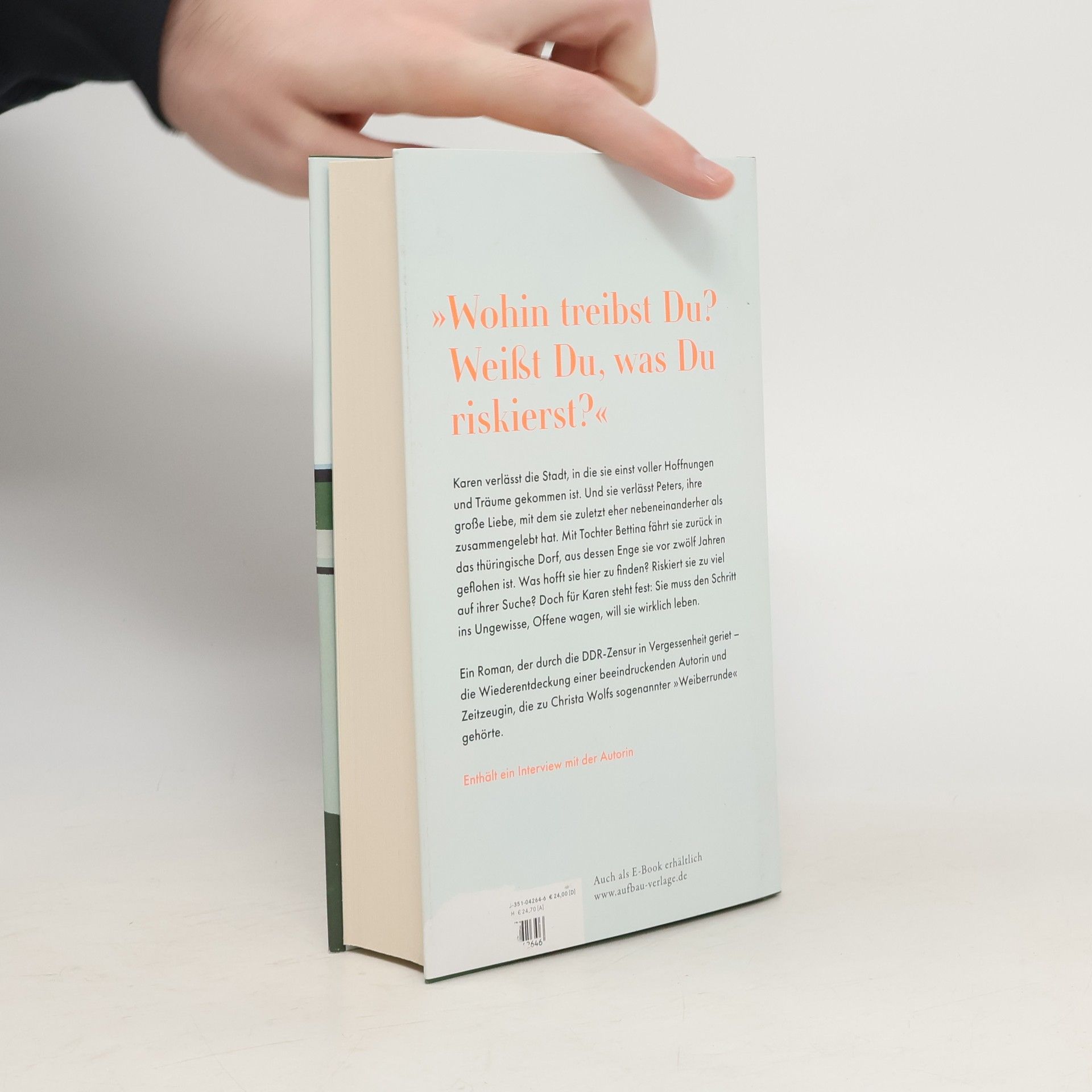 »Wohin treibst Du? Weißt Du, was Du riskierst?« Karen verlässt die Stadt, in die sie einst voller Hoffnungen und Träume gekommen ist. Und sie verlässt Peters, ihre große Liebe, mit dem sie zuletzt eher nebeneinanderher als zusammengelebt hat. Mit Tochter Bettina fährt sie zurück in das thüringische Dorf, aus dessen Enge sie vor zwölf Jahren geflohen ist. Was hofft sie hier zu finden? Riskiert sie zu viel auf ihrer Suche? Doch für Karen steht fest: Sie muss den Schritt ins Ungewisse, Offene wagen, will sie wirklich leben. Ein Roman, der durch die DDR-Zensur in Vergessenheit geriet – die Wiederentdeckung einer beeindruckenden Autorin und Zeitzeugin, die zu Christa Wolfs sogenannter »Weiberrunde« gehörte: mit einem Interview mit der Autorin