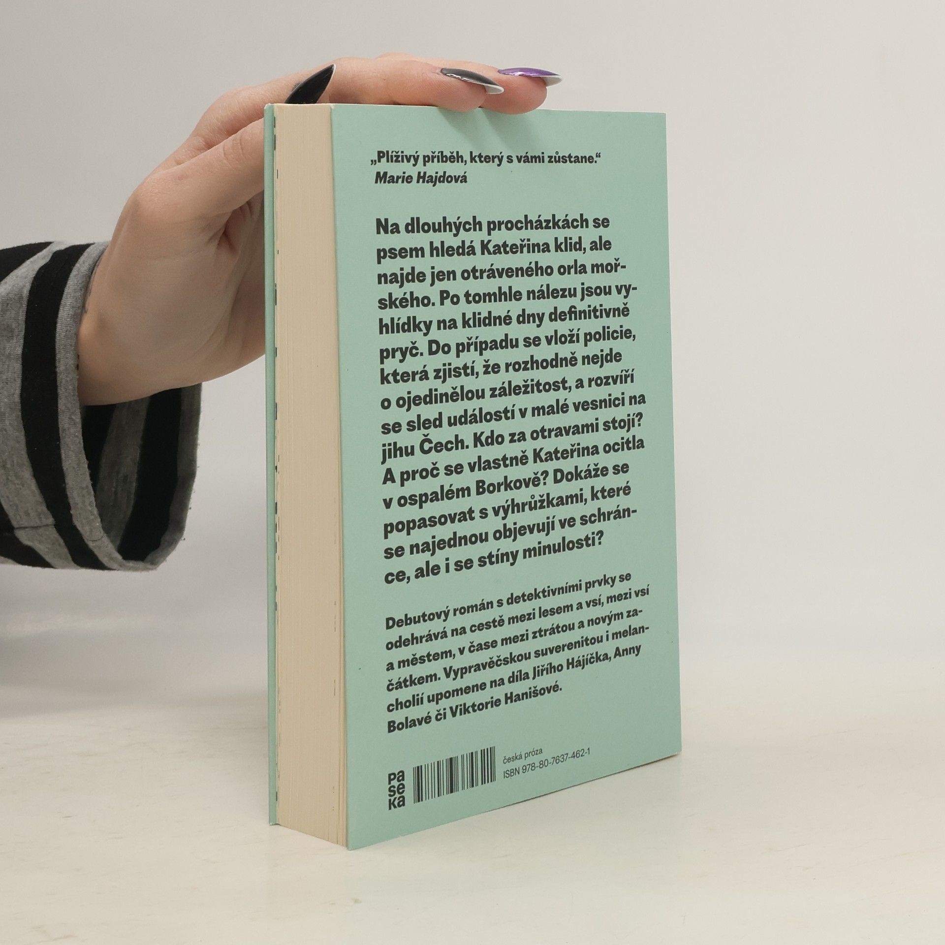 Na dlouhých procházkách se psem hledá Kateřina klid, ale najde jen otráveného orla mořského. Po tomhle nálezu jsou vyhlídky na klidné dny definitivně pryč. Do případu se vloží policie, která zjistí, že rozhodně nejde o ojedinělou záležitost, a rozvíří se sled událostí v malé vesnici na jihu Čech. Kdo za otravami stojí? A proč se vlastně Kateřina ocitla v ospalém Borkově? Dokáže se popasovat s výhrůžkami, které se najednou objevují ve schránce, ale i se stíny minulosti? Debutový román s detektivními prvky se odehrává na cestě mezi lesem a vsí, mezi vsí a městem, v čase mezi ztrátou a novým začátkem. Vypravěčskou suverenitou i melancholií upomene na díla Jiřího Hájíčka, Anny Bolavé či Viktorie Hanišové.