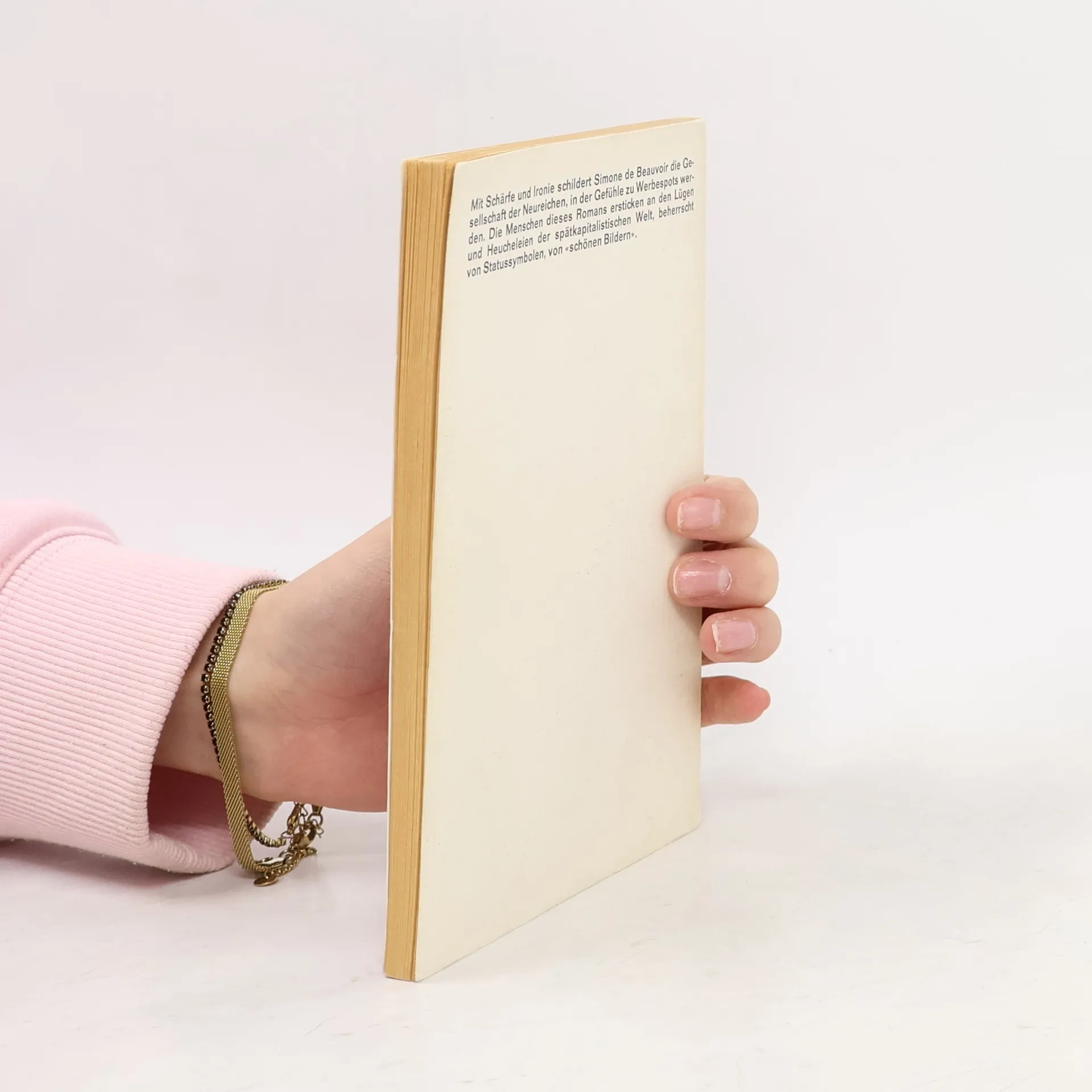 Mit Schärfe und Ironie schildert Simone de Beauvoir die Gesellschaft der Neureichen, in der Gefühle zu Werbespots werden. Die Menschen dieses Romans ersticken an den Lügen und Heuchelein der spätkapitalistischen Welt, beherrscht von Statussymbolen, von «schönen Bildern».