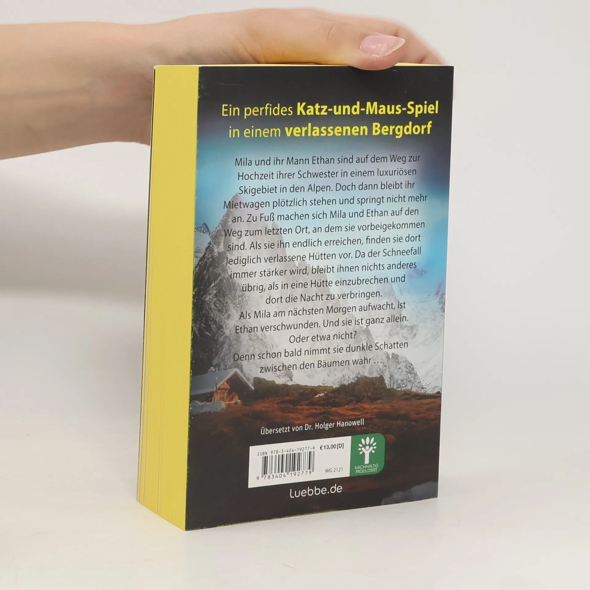 Ein perfides Katz-und-Maus-Spiel in einem verlassenen Bergdorf Mila und ihr Mann Ethan sind auf dem Weg zur Hochzeit ihrer Schwester in einem luxuriösen Skigebiet in den Alpen. Doch dann bleibt ihr Mietwagen plötzlich stehen und springt nicht mehr an. Zu Fuß machen sich Mila und Ethan auf den Weg zurück zu dem letzten Ort, an dem sie vorbeigekommen sind. Als sie ihn endlich erreichen, finden sie dort lediglich verlassene Hütten vor. Da der Schneefall immer stärker wird, bleibt ihnen nichts anderes übrig, als in eine Hütte einzubrechen und dort die Nacht zu verbringen. Als Mila am nächsten Morgen aufwacht, ist Ethan verschwunden. Und sie ist ganz allein. Oder etwa nicht? Denn schon bald nimmt sie dunkle Schatten zwischen den Bäumen wahr ...