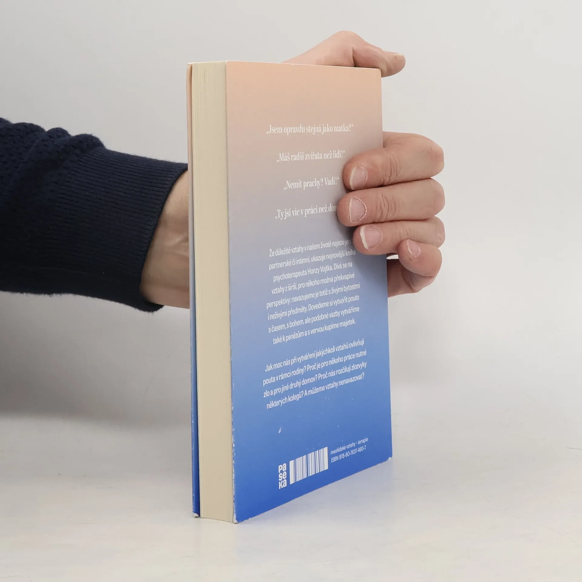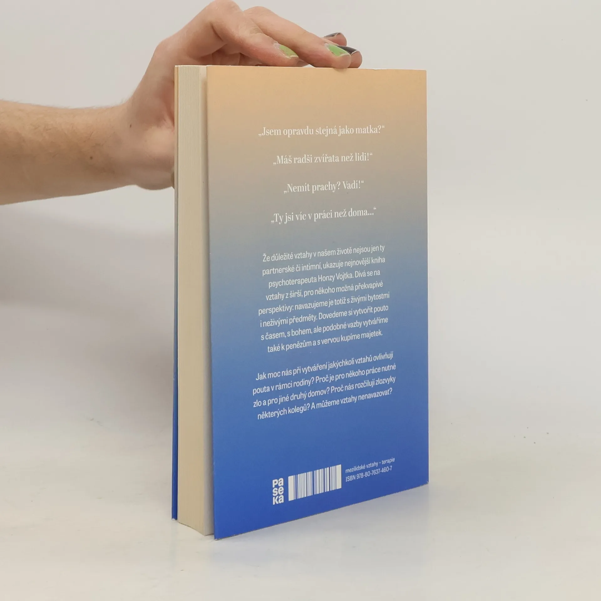 „Jsem opravdu stejná jako matka? „Máš radši zvířata než lidi! „Nemít prachy? Vadí! „Ty jsi víc v práci než doma Že důležité vztahy v našem životě nejsou jen ty partnerské či intimní, ukazuje nejnovější kniha psychoterapeuta Honzy Vojtka. Dívá se na vztahy z širší, pro někoho možná překvapivé perspektivy: navazujeme je totiž s živými bytostmi i neživými předměty. Dovedeme si vytvořit pouto s časem, s bohem, ale podobné vazby vytváříme také k penězům a s vervou kupíme majetek. Jak moc nás při vytváření jakýchkoliv vztahů ovlivňují pouta v rámci rodiny? Proč je pro někoho práce nutné zlo a pro jiné druhý domov? Proč nás rozčilují zlozvyky některých kolegů? A můžeme vztahy nenavazovat?