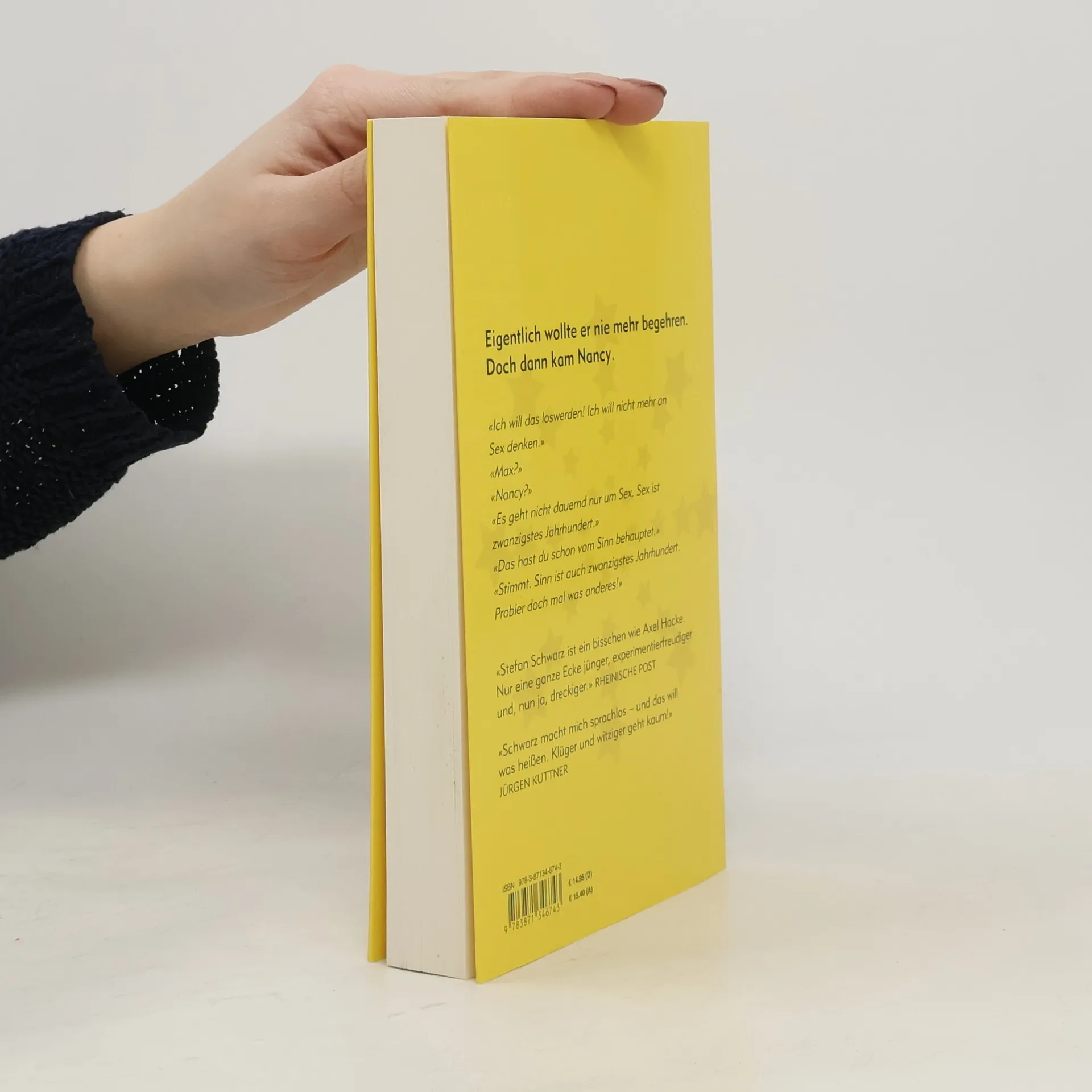 Eigentlich wollte er nie mehr begehren. Doch dann kam Nancy. «Ich will das loswerden! Ich will nicht mehr an Sex denken.» «Max?» «Nancy?» «Es geht nicht dauernd nur um Sex. Sex ist zwanzigstes Jahrhundert.» «Das hast du schon vom Sinn behauptet.» «Stimmt. Sinn ist auch zwanzigstes Jahrhundert. Probier doch mal was anderes!» «Stefan Schwarz ist ein bisschen wie Axel Hacke. Nur eine ganze Ecke jünger, experimentierfreudiger und, nun ja, dreckiger.» Rheinische Post «Schwarz macht mich sprachlos – und das will was heißen. Klüger und witziger geht kaum!» Jürgen Kuttner