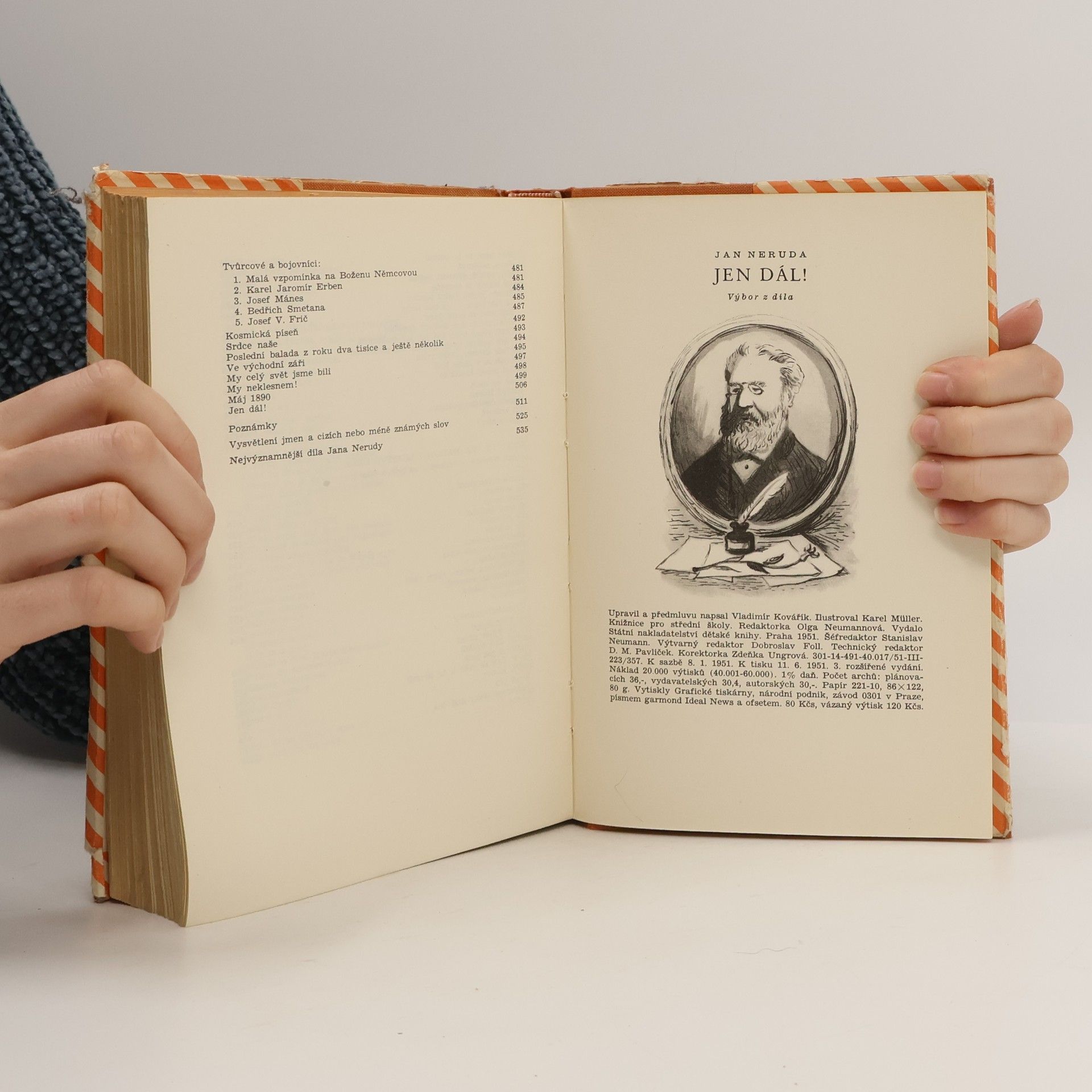 Neruda, "náš největší básník, vidící ještě i daleko přes nás do budoucnosti" (J. Fučík, Reportáž psaná na oprátce), Neruda, jehož básnickým credem bylo: "Studovat český lid, nechť na venkově, nechť v městě, toť úkol našeho spisovatele!" Neruda, bojovník za pravdu, pokrok, svobodu národa a celého lidstva, mluví k nám ze všech básní, feuilletonů a povídek výboru, který je ve svém 3. vyd. značně rozšířen a rozhojněn o mnohé další ukázky, charakterisující Nerudovo dílo a život, dobu ve které básník žil. Od vzpomínek na proletářské dětství malostranského chlapce (část I.: Mne osud do kolébky tvrdé dal) přes povídky, feuilletony a básně o utrpení a bídě lidu (část II.: Zpívám o chudobě), Písně kosmické, Balady a romance, Prosté motivy (ukázky z těchto sbírek v III. části: Volím slovo prosté) až k boji za práva lidu (část IV.: Za národ i lidstvo celé - ukázky ze Zpěvů pátečních, arabesek, studií a portrétů, povídek a slavný feuilleton Máj 1890, v němž se Neruda tak nekompromisně postavil do řad dělnictva, bojujícího za svá práva), poznáváme v knize tohoto velkého básníka, novináře, spisovatele a bojovníka.