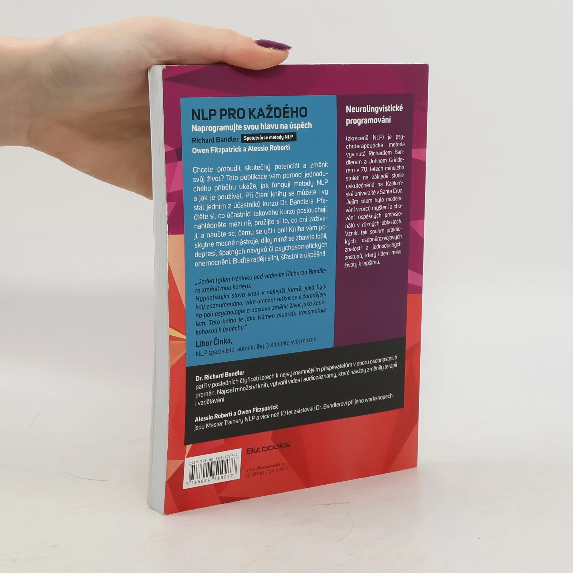 Chcete probudit skutečný potenciál a změnit svůj život? Tato kniha vám pomocí jednoduchého příběhu ukáže, jak fungují metody neurolingvistického programování a jak je používat. Při čtení knihy se můžete i vy stát jedním z účastníků kurzu Dr. Bandlera. Kniha vám poskytne mocné nástroje, díky nimž se zbavíte fobií, depresí, špatných návyků či psychosomatických onemocnění. Buďte raději silní, šťastní a úspěšní!