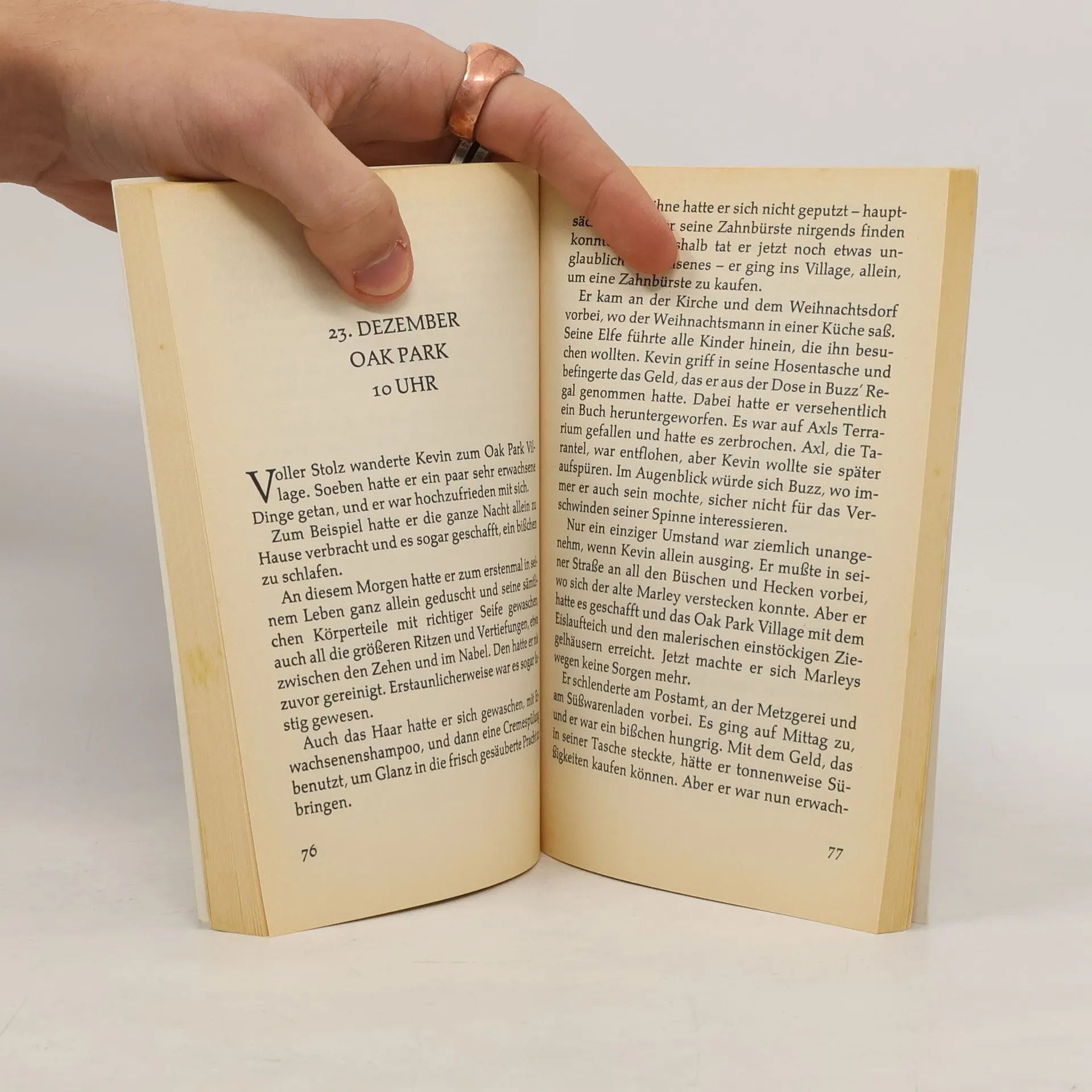 Im Tohuwabohu der Reisevorbereitungen von Familie McAllister wird der kleinste Sohn Kevin glatt vergessen. Erst im Flugzeug nach Paris fällt Mama Kate das Fehlen des Sohnemanns auf. Postwendend macht sie sich auf den Rückweg. Kevin läßt es sich derweil gutgehen und erprobt alles, was Kindern sonst untersagt ist. Langsam beginnt er, seine 'verhaßte' Familie zu vermissen. Bald freundet sich Kevin bei der Weihnachtsmesse mit seinem Nachbarn an, der nicht der gefürchtete schwarze Mann ist, sondern ein einsamer alter Herr. Bevor die Familie wieder vereint feiern kann, muß Kevin jedoch noch zwei gerissene Einbrecher vertreiben. Eine Familienkomödie ohne Familie. Das Buch zum Film.