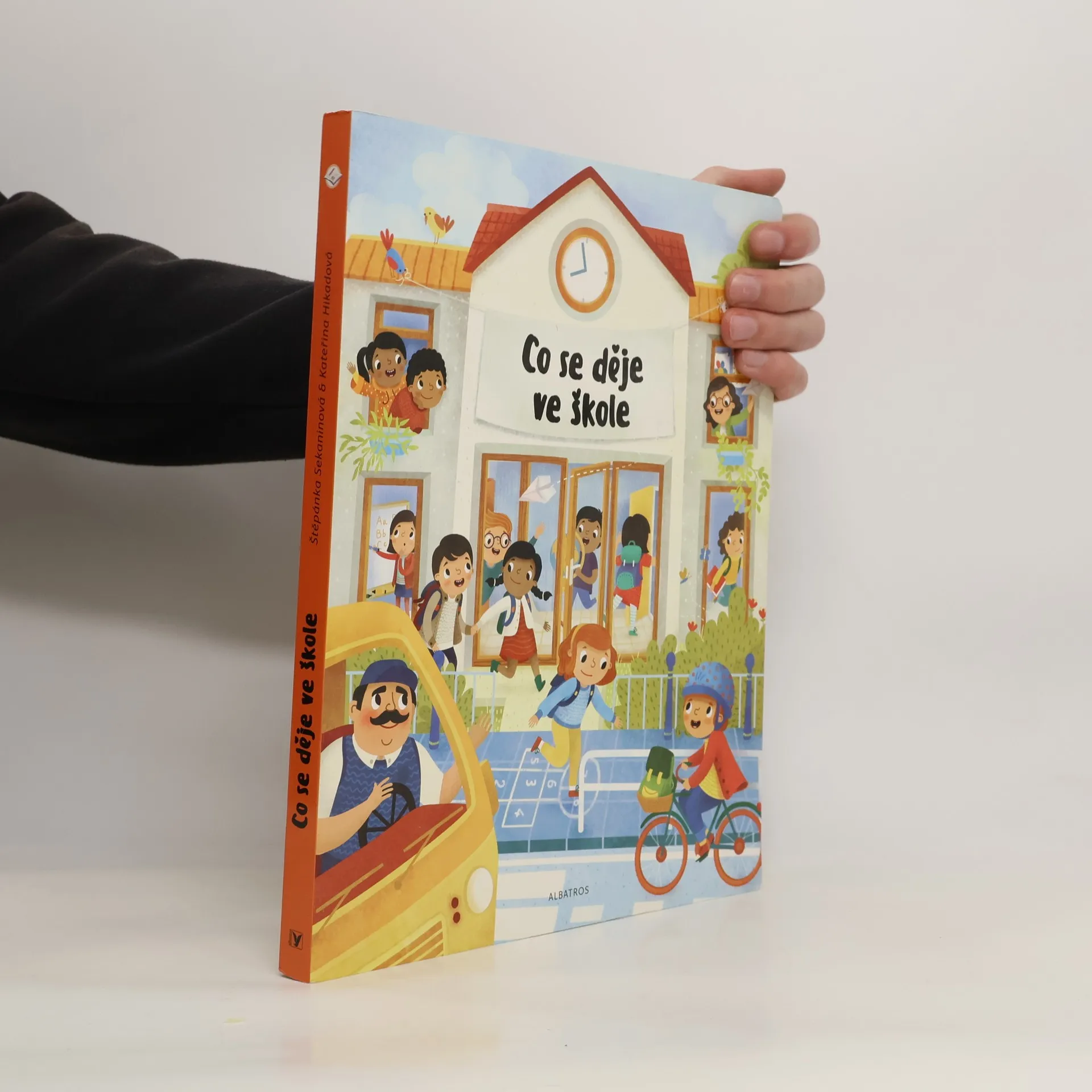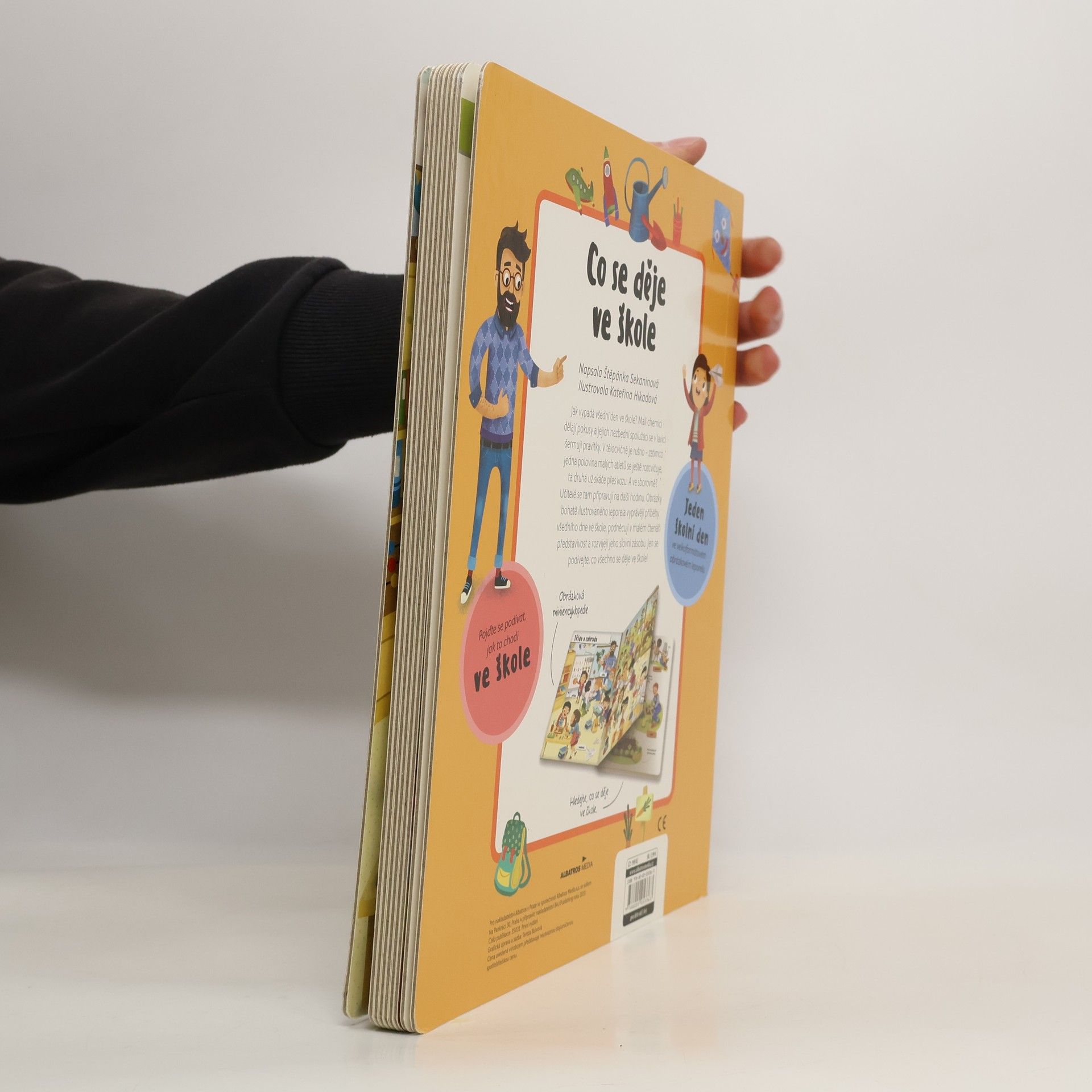 Jak vypadá všední den ve škole? Malí chemici dělají pokusy a jejich nezbední spolužáci se v lavici šermují pravítky. Venku na zahradě děti hrabou listí a paní učitelka jim ukazuje, jak sázet rostlinu do země. Obrázky, které vyprávějí příběhy všedního dne ve škole, podněcují v malém čtenáři představivost a pomáhají mu rozvíjet slovní zásobu.