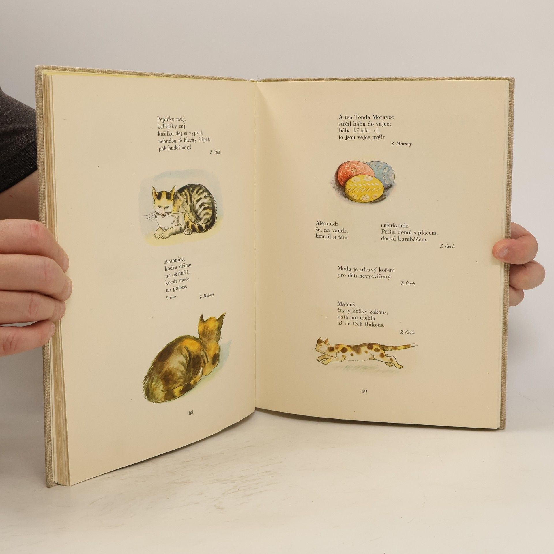 Nádherná kniha původních pohádek, říkaček a písniček. Obsah: Já jsem z Vorlíka, Jede bába s kopečka, Byla jedna babka, Dědek a bába, Na jarmark, Z trhu, Koleda, koleda, dědku !, Pro koláček, Co bude k obědu ?, Kuchařka, Kmotr Matěj, Nenasytný Honza, Juchej !, Kačenka, Sedí Káča na lavici, Honza, Silný Honza, Když jsem šel, Jak sedlák měnil, Já o voze, on o koze, Měj se dobře, stará košatino !, Má milá lenost, Práce a jídlo, Co chválit nemůžeš, nehaň !, Lakomec, Slyšte, lidé !, Kdo má uši, poslechni !, Kdo nevěří, ať tam běží, Každé slovo lež, Za vraty, Mlátí, mlátí, nikdy neobrátí, Kmotráme vás, vítáčku !, Šla Prokopka, Hádej, hádej, hadači, Matěji, Matěji !, Naše Madla, Tu je Zálší, tam Mažice, Kovář, Narodil se krejčí pán, Ševci, Pro libru masa, Jsou mlynáři, Hastrman ve mlýne, Kominík, Sedlák, Sedlák se selkou, Cikán, Cikán kosec, Komu je tak blaze ?, Bohatý jak kozel rohatý, Strašidlo, Honza v kostnici, Smutná hodina, Tu mě bolí, Až já umřu, Pláč nad utopenou myškou, Formanova kobyla, Koza rohatá, Hurdálek na vandru, Sedí vrabec, Hej, krkavec, krkavec, Sova na svatbě, Žáby, Vandrovala blecha, Zadudej, dudáčku, Muzika, Tancuj se mnou !, Pějme píseň dokola. První vydání. Cena knihy v čase vydání: 38.- Kčs. 56/VII-18