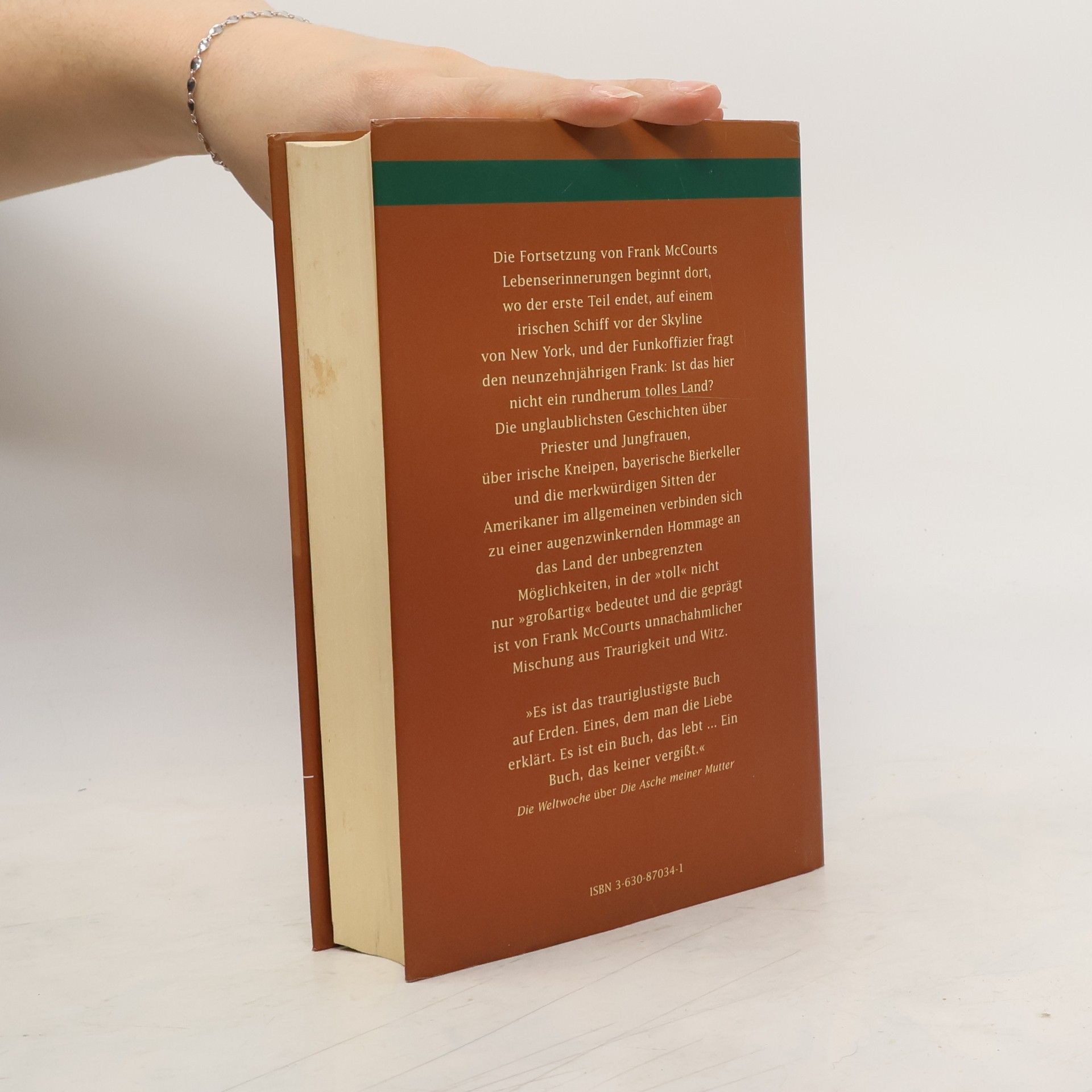 Die Fortsetzung von Frank McCourts Lebenserinnerungen beginnt auf einem irischen Schiff vor New York, wo der neunzehnjährige Frank mit nichts als Hoffnung auf eine bessere Zukunft ankommt. Arm, mit schlechten Zähnen und entzündeten Augen, muss er schnell feststellen, dass sein Aussehen und Akzent ihn im neuen Land als Außenseiter erscheinen lassen. Doch mit der Hilfe eines unkonventionellen katholischen Priesters, der demokratischen Partei und der US Army findet er seinen Platz in der Gesellschaft. Seine ungewöhnlichen Stationen reichen von Hoteldiener über Hafenarbeiter bis hin zu Soldat in Bad Tölz, wo er vom Hundeabrichter zum Materialverwalter aufsteigt. Trotz aller Widrigkeiten wird er High-School-Lehrer, dank der GI-Bill, seiner Liebe zur Literatur und seinem unerschütterlichen Humor. Er gründet eine Familie und holt seine Mutter und Brüder aus Limerick nach. Seine Frau ist Protestantin, und abends erzählt er in irischen Kneipen Anekdoten aus seinem Leben. Auch Limerick besucht er erneut, um die Asche seiner Mutter auf den Gräbern der Familie zu verstreuen. McCourts zweiter Erinnerungsband ist voll unglaublicher Geschichten über Priester, irische Kneipen und die Eigenheiten der Amerikaner, geschildert mit seiner unverwechselbaren Mischung aus Traurigkeit und Witz.