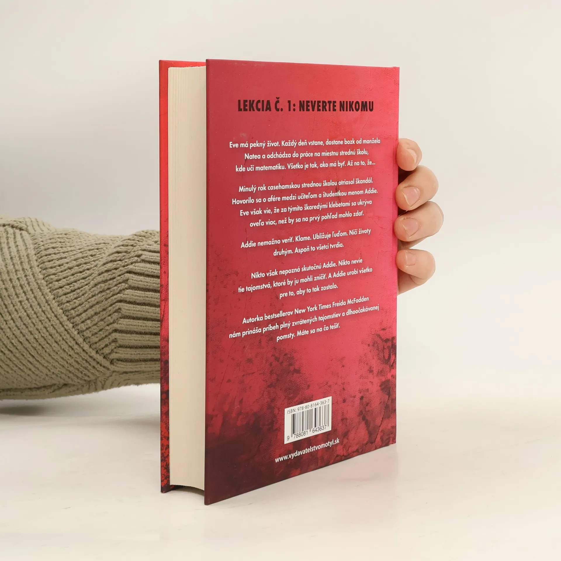 Eve má pekný život. Každý deň vstane, dostane bozk od manžela Natea a odchádza do práce na miestnu strednú školu, kde učí matematiku. Všetko je tak, ako má byť. Až na to, že... Minulý rok casehamskou strednou školou otriasol škandál. Hovorilo sa o afére medzi učiteľom a študentkou menomAddie. Eve však vie, že za týmito škaredými klebetami sa ukrýva oveľa viac, než by sa na prvý pohľad mohlo zdať. Addie nemožno veriť. Klame. Ubližuje ľuďom. Ničí životy druhým. Aspoň to všetci tvrdia. Nikto však nepozná skutočnú Addie. Nikto nevie tie tajomstvá, ktoré by ju mohli zničiť. A Addie urobí všetko pre to, aby to tak zostalo. Autorka bestsellerov New York Times Freida McFadden nám prináša príbeh plný zvrátených tajomstiev a dlho očakávanej pomsty. Máte sa na čo tešiť.