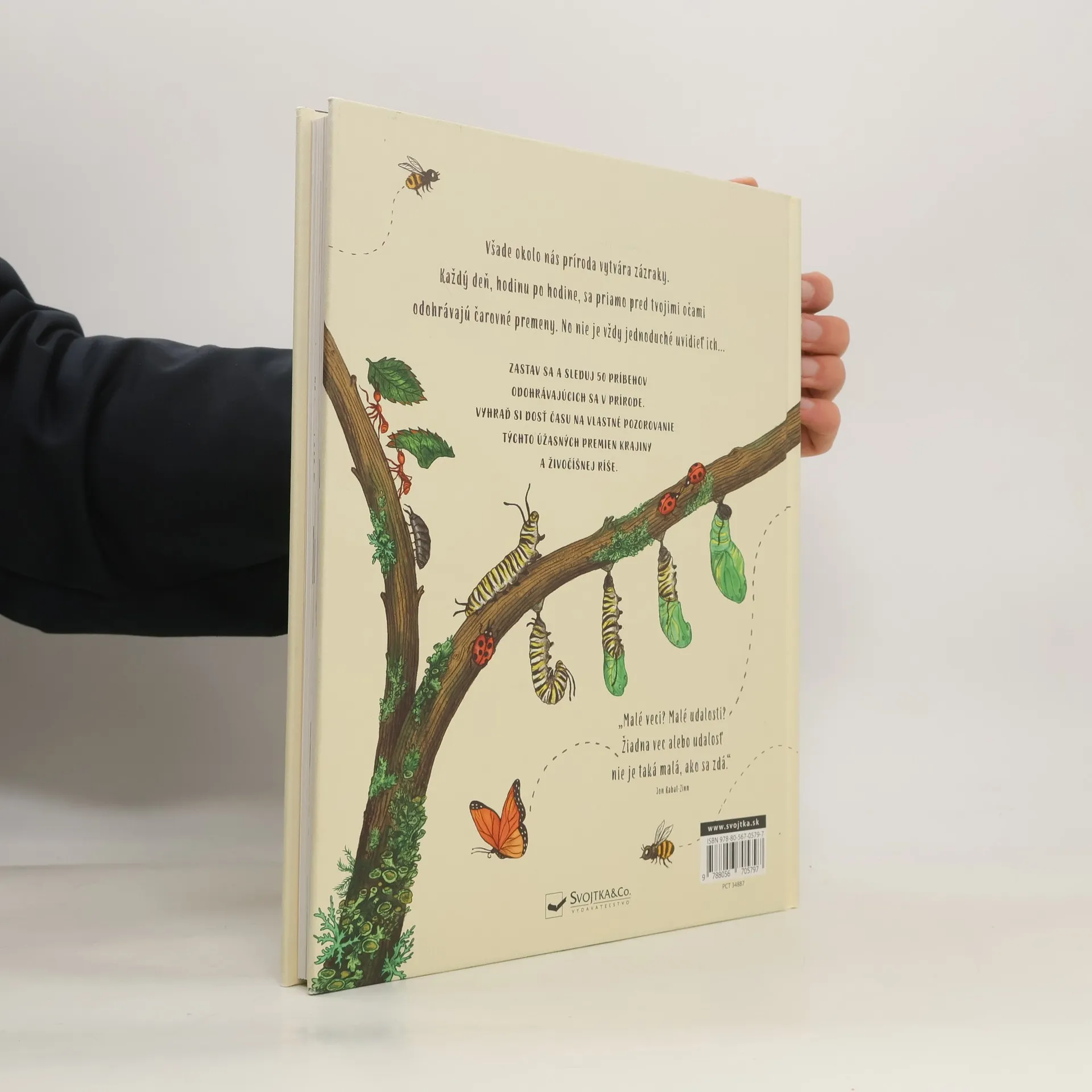 Táto kniha je plná úžasných udalostí, ktoré sa každý deň odohrávajú v prírode. Niektoré z nich trvajú dlho, dni i týždne napríklad húsenica, ktorá sa zakuklila a vyliahne sa ako dospelý motýľ, alebo veverička zahrabávajúca si zásoby žaluďov na zimu. Iné zbadáš iba v okamihu východslnka alebo mraky meniace svoj tvar. 50 príbehov z prírody sprevádzajú farebné ilustrácie. Zastav sa teda, prezeraj si knihu a sleduj tieto ohromné udalosti. Obdivuj prírodu v jej rozmanitosti. Uvidíš, čo všetko objavíš a spoznáš, keď si urobíš na prezeranie knihy a pozorovanie prírody dostatok času.