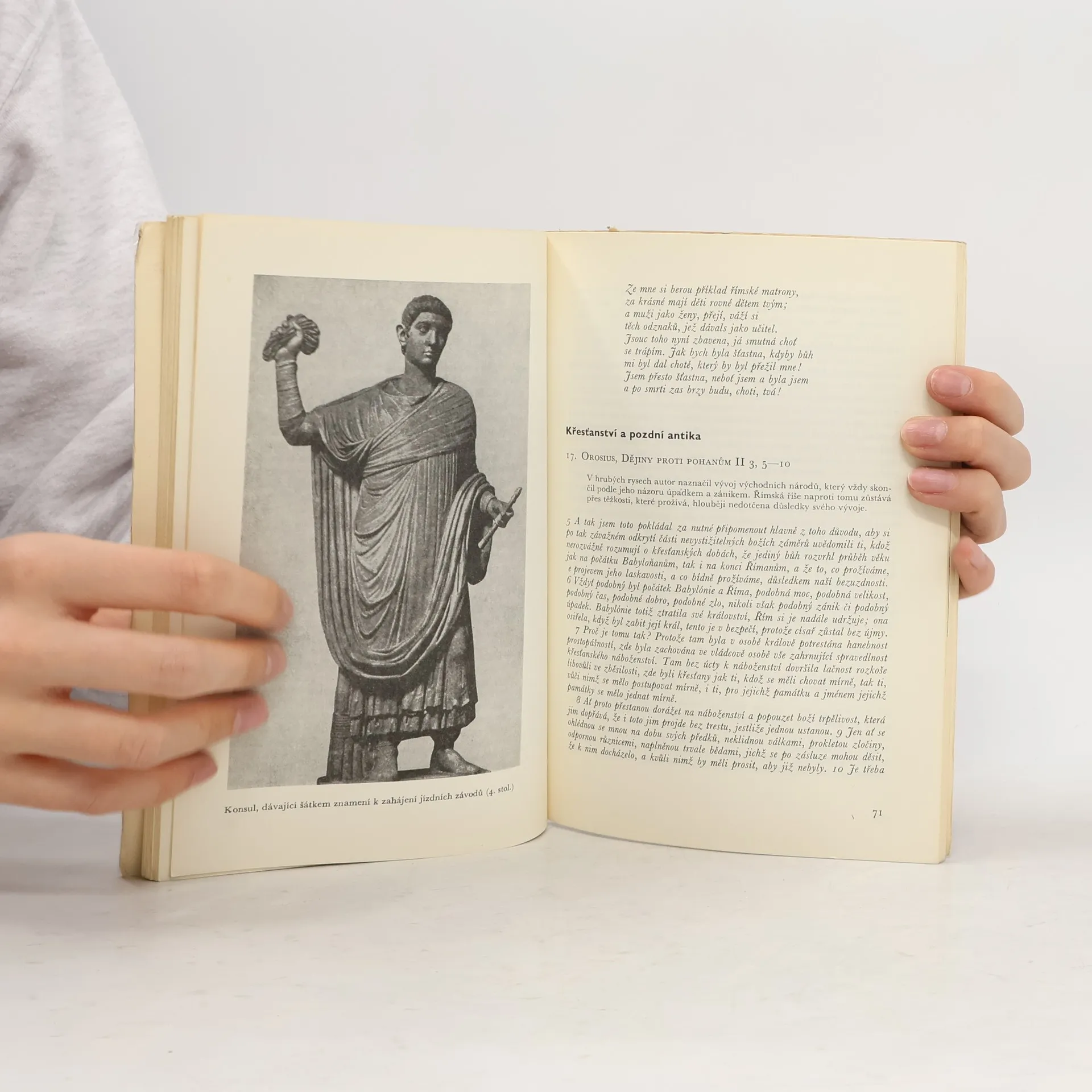 Promyšleně sestavený výbor z antických a raně středověkých textů pomáhá osvětlit složitou dobu konce antiky a počátků středověku. Autor vybral pramenné ukázky nejrůznějšího charakteru - úryvky z děl historiků, filosofů, výňatky z císařských výnosů, zákoníků, korespondence, básní atd., které umožňují mnohostranný pohled na život a kulturu společnosti, považované staršími historiky za jednoznačně úpadkovou. Texty jsou doplněny stručným úvodem, metodickými poznámkami, vysvětlivkami a výkladovým rejstříkem.