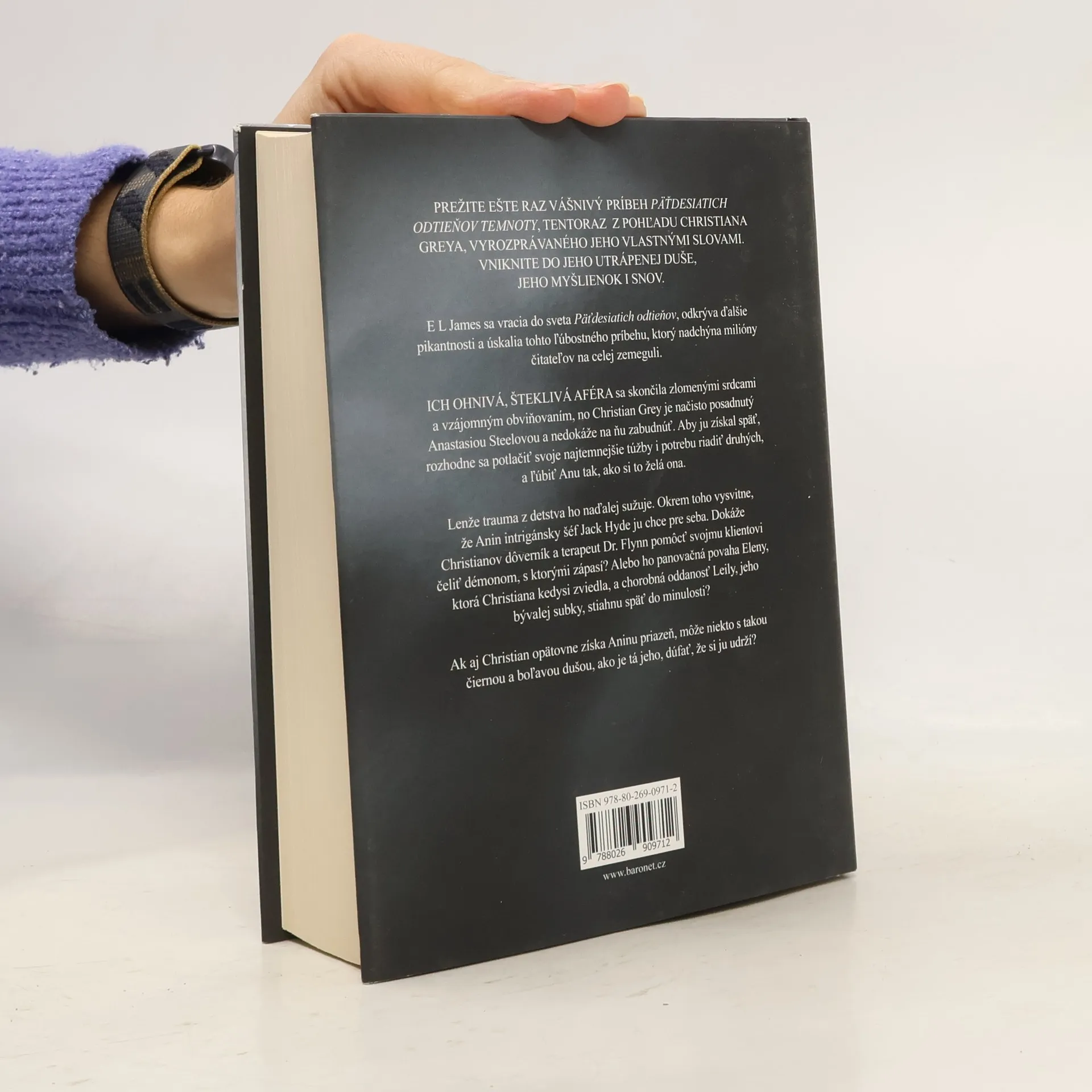 E L James sa vracia do sveta Päťdesiatich odtieňov, odkrýva ďalšie pikantnosti a úskalia tohto ľúbostného príbehu, ktorý nadchýna milióny čitateľov na celej zemeguli. ICH OHNIVÁ, ŠTEKLIVÁ AFÉRA sa skončila zlomenými srdcami a vzájomným obviňovaním, no Christian Grey je načisto posadnutý Anastasiou Steelovou a nedokáže na ňu zabudnúť. Aby ju získal späť, rozhodne sa potlačiť svoje najtemnejšie túžby i potrebu riadiť druhých, a ľúbiť Anu tak, ako si to želá ona. Lenže trauma z detstva ho naďalej sužuje. Okrem toho vysvitne, že Anin intrigánsky šéf Jack Hyde ju chce pre seba. Dokáže Christianov dôverník a terapeut Dr. Flynn pomôcť svojmu klientovi čeliť démonom, s ktorými zápasí? Alebo ho panovačná povaha Eleny, ktorá Christiana kedysi zviedla, a chorobná oddanosť Leily, jeho bývalej subky, stiahnu späť do minulosti? Ak aj Christian opätovne získa Aninu priazeň, môže niekto s takou čiernou a boľavou dušou, ako je tá jeho, dúfať, že si ju udrží?
