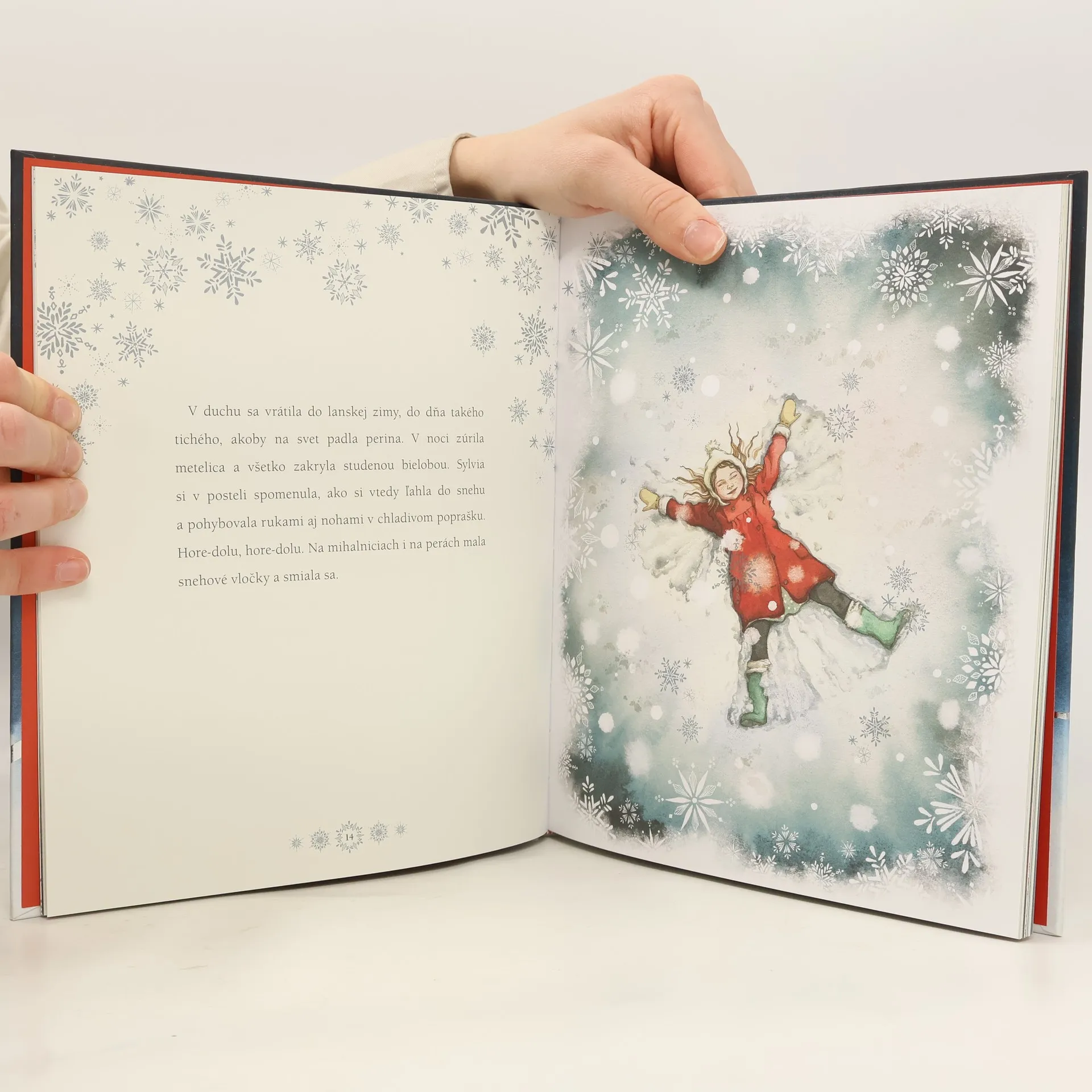 Sylvie sa raz v noci náhle zobudí a zazrie niečo neuveriteľné. Obrovské krídla z najjemnejšieho snehobieleho peria, aké si vieme predstaviť. V jej spálni stojí anjel, ktorého si kedysi vytvorila v snehu. Prezradí jej, že ju prišiel ochrániť pred chorobou. Keď sa Sylvie zotaví, znovu sa s ním túži stretnúť. Podmanivá rozprávka o zázraku počas jedného zasneženého dňa plná krásnych ilustrácií, dojemných rozhovorov a rozprávkového jazyka.