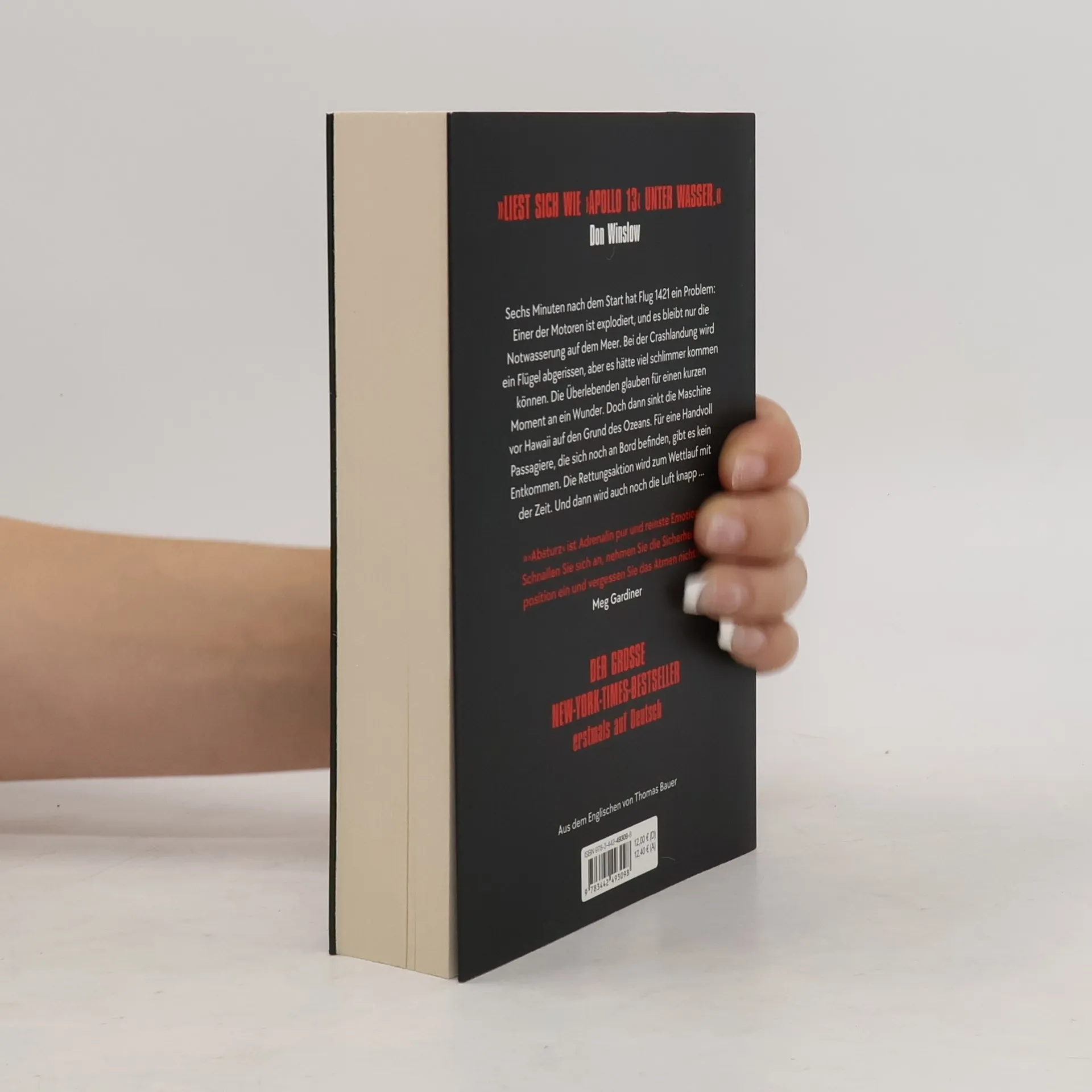 »Liest sich wie ›Apollo 13‹ unter Wasser.« Don Winslow Ein gesunkenes Flugzeug, eingeschlossene Passagiere und eine fast aussichtslose Rettungsaktion ... Sechs Minuten nach dem Start stürzt Flug 1421 ins Meer. Die Überlebenden des Crashs glauben für einen kurzen Moment an ein Wunder – sie haben es geschafft! Dann sinkt die Maschine vor Hawaii auf den Grund des Ozeans. Und es gibt es kein Entkommen. Obwohl die Chancen auf Rettung minimal sind, wird sofort ein Großeinsatz geplant. Doch die Zeit läuft gegen die im Flugzeug eingeschlossenen Passagiere. Denn bald wird auch die Luft knapp ... »›Absturz‹ ist Adrenalin pur und reinste Emotion. Man ist von der ersten Seite an gebannt, wenn Crew und Passagiere eines gesunkenen Flugzeugs um ihr Überleben kämpfen und Rettungskräfte einen Wettlauf gegen die Zeit gewinnen müssen. Schnallen Sie sich an, nehmen Sie die Sicherheitsposition ein, und vergessen Sie das Atmen nicht!« Meg Gardiner
