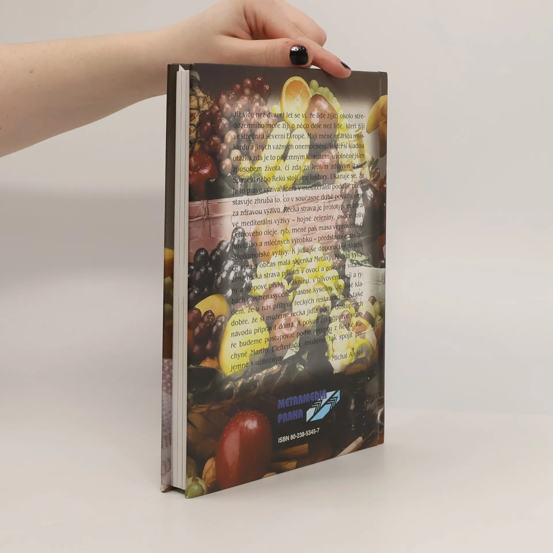 Kulinářská tradice a kultura řeckého stolování v minulosti i dnes. Neměnné a charakteristické složky a ingredience řecké kuchyně (byliny a koření), nejznámější řecká jídla a nejčastější řecké omáčky a polevy. Přehled receptů na typické řecké předkrmy, polévky, saláty, pilafy. Nejrůznější recepty a způsoby přípravy masa, zeleninových jídel, ryb a plodů moře, ovocných zavařenin a sladkých moučníků. Nechybí ani výklad o přípravě a druzích kávy a stručný přehled řeckých vín.