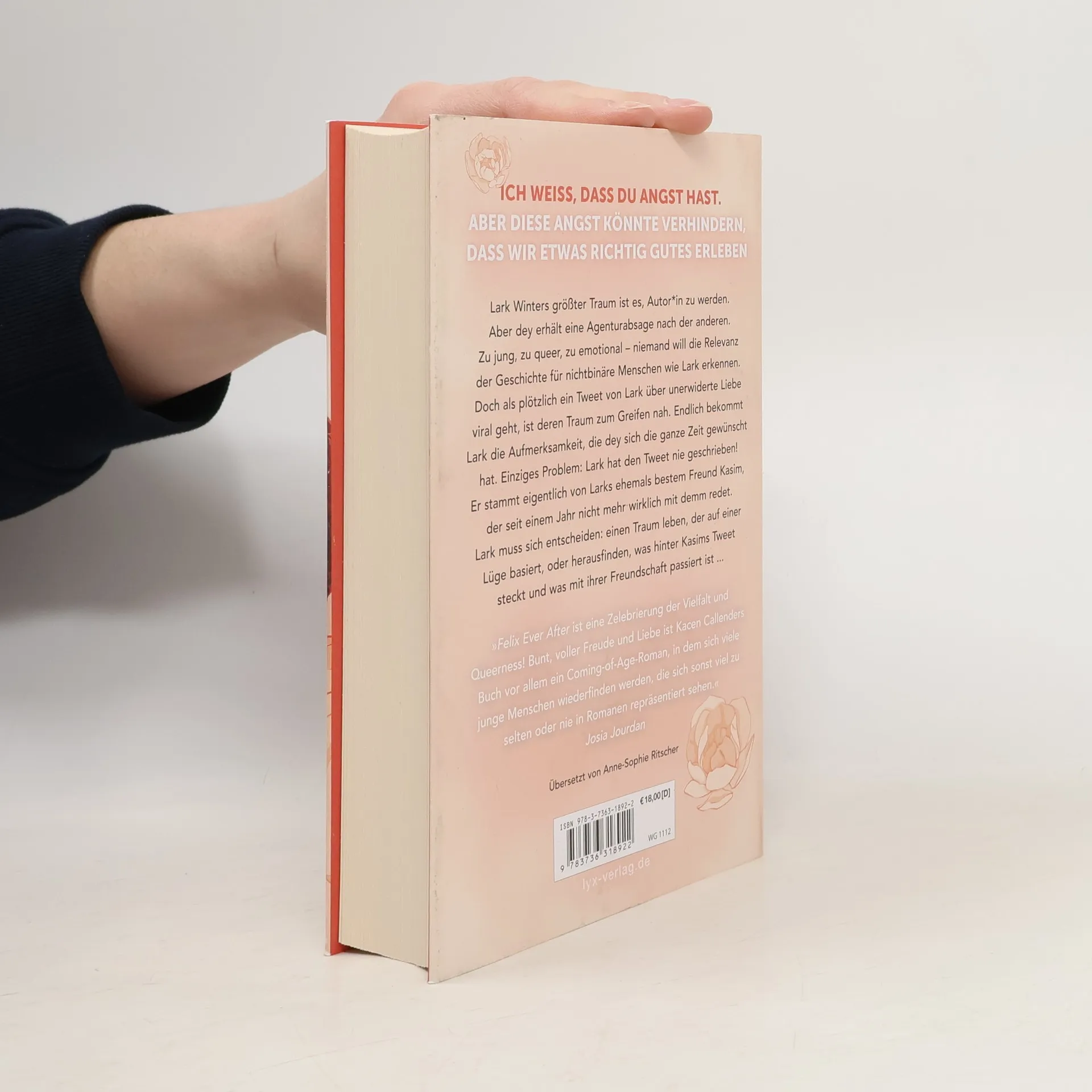 „Ich weiß, dass du Angst hast. Aber diese Angst könnte verhindern, dass wir etwas richtig Gutes erleben“ Lark Winters größter Traum ist es, Autor*in zu werden. Aber dey erhält eine Agenturabsage nach der anderen. Zu jung, zu queer, zu emotional - niemand will die Relevanz der Geschichte für nichtbinäre Menschen wie Lark erkennen. Doch als plötzlich ein Tweet von Lark über unerwiderte Liebe viral geht, ist deren Traum zum Greifen nah. Endlich bekommt Lark die Aufmerksamkeit, die dey sich die ganze Zeit gewünscht hat. Einziges Problem: Lark hat den Tweet nie geschrieben! Er stammt eigentlich von Larks ehemals bestem Freund Kasim, der seit einem Jahr nicht mehr wirklich mit demm redet. Lark muss sich entscheiden: einen Traum leben, der auf einer Lüge basiert, oder herausfinden, was hinter Kasims Tweet steckt und was mit ihrer Freundschaft passiert ist ... „ FELIX EVER AFTER ist eine Zelebrierung der Vielfalt und Queerness! Bunt, voller Freude und Liebe ist Kacen Callenders Buch vor allem ein Coming-of-Age-Roman, in dem sich viele junge Menschen wiederfinden werden, die sich sonst viel zu selten oder nie in Romanen repräsentiert sehen.“ JOSIA JOURDAN über FELIX EVER AFTER