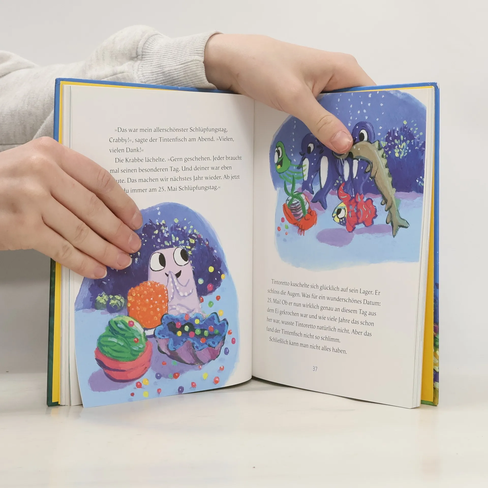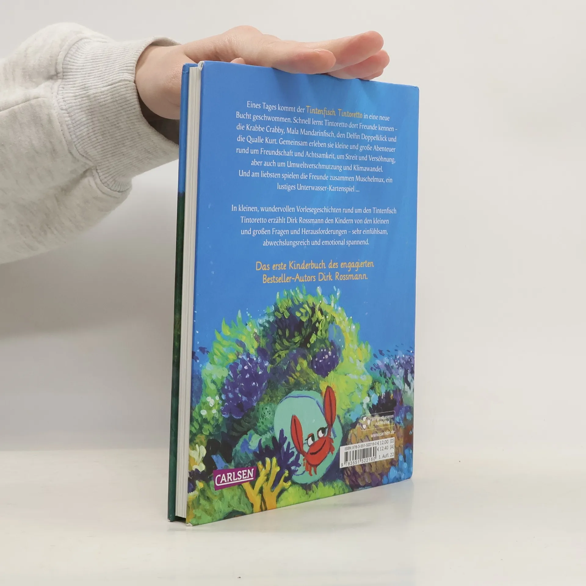 Der Tintenfisch Tintoretto kommt neu in die Bucht und lernt dort Crabby Krabbe, Mala Mandarinfisch, den Delfin Doppelklick und die Qualle Kurt kennen. Gemeinsam macht das Leben im Ozean noch mehr Spaß. Die Freunde erleben Abenteuer, helfen sich aber auch gegenseitig aus der Patsche und kämpfen gegen die Umweltverschmutzung. In Vorlesegeschichten rund um einen Tintenfisch erzählt Dirk Rossmann den Kindern von den kleinen und großen Fragen und Herausforderungen, einfühlsam, abwechslungsreich und emotional spannend. Das erste Kinderbuch des engagierten Bestseller-Autors!