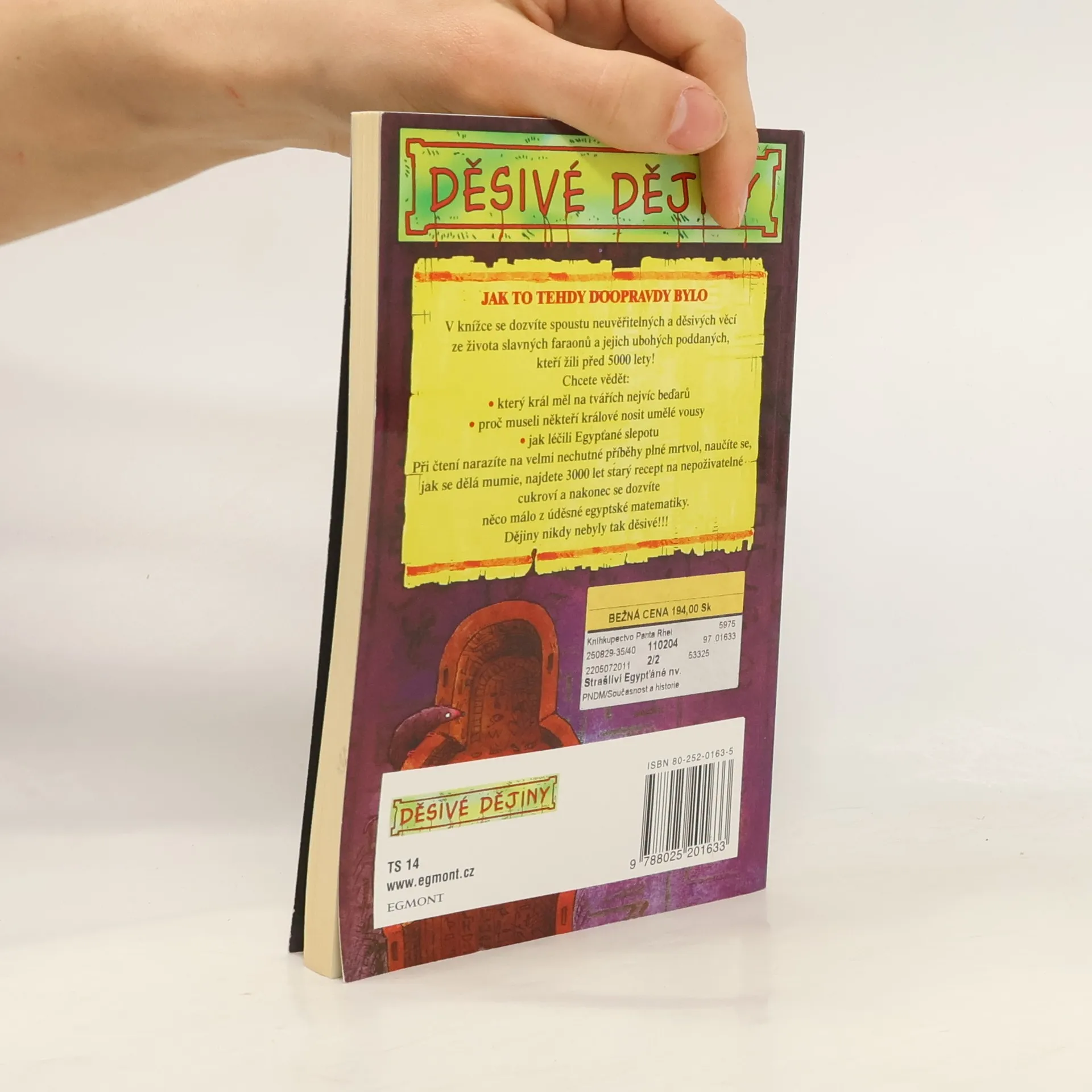 Jak to tehdy doopravdy bylo! V knížce se dozvíte spoustu neuvěřitelných a děsivých věcí ze života slavných faraonů a jejich ubohých poddaných, kteří žili před 5000 lety! Chcete vědět: . který král měl na tvářích nejvíc beďarů? . proč museli někteří králové nosit umělé vousy? . jak léčili Egypťané slepotu? Při čtení narazíte na velmi nechutné příběhy plné mrtvol, naučíte se, jak se dělá mumie, najdete 3000 let starý recept na nepoživatelné cukroví a nakonec se dozvíte něco málo z úděsné egyptské matematiky. Dějiny,nikdy nebyly tak děsivé!!!