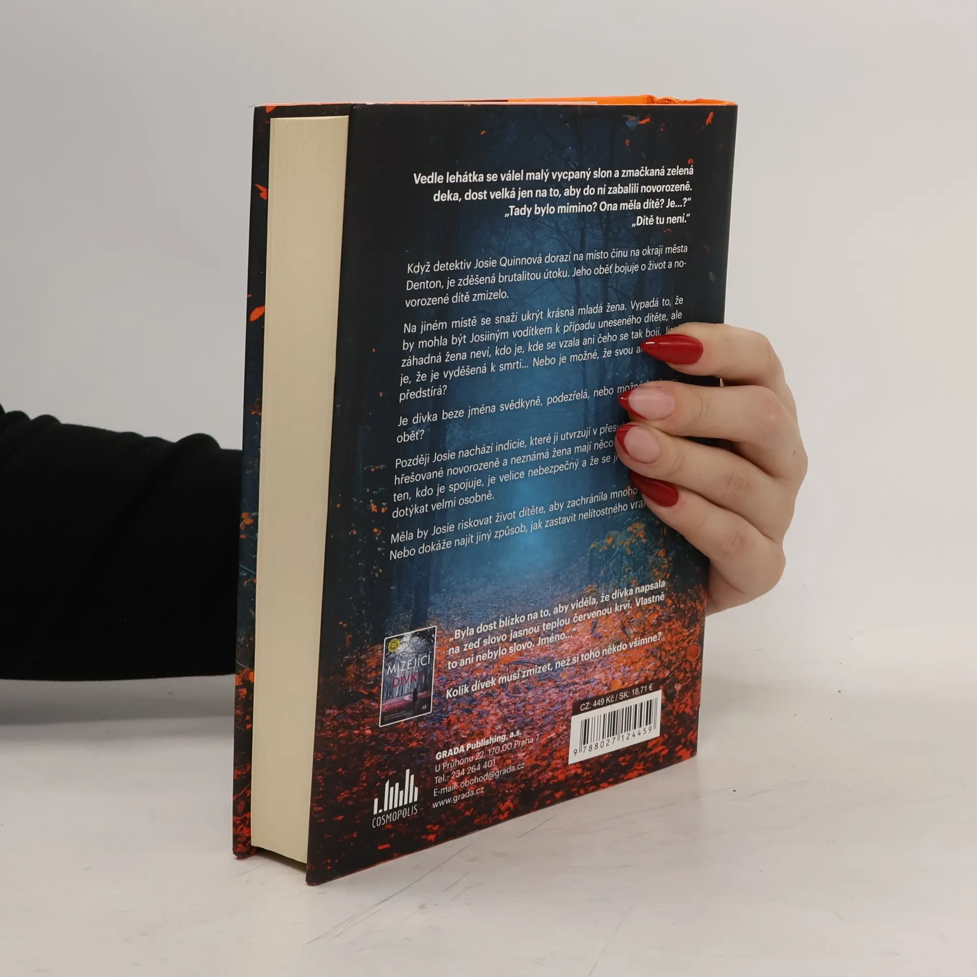 Vedle lehátka se válel malý vycpaný slon a zmačkaná zelená deka, dost velká jen na to, aby do ní zabalili novorozeně. „Tady bylo mimino? Ona měla dítě? Je…?“ „Dítě tu není.“ Když detektiv Josie Quinnová dorazí na místo činu na okraji města Denton, je zděšená brutalitou útoku. Jeho oběť bojuje o život a novorozené dítě zmizelo. Na jiném místě se snaží ukrýt krásná mladá žena. Vypadá to, že by mohla být Josiiným vodítkem k případu uneseného dítěte, ale záhadná žena neví, kdo je, kde se vzala ani čeho se tak bojí. Jisté je, že je vyděšená k smrti… Nebo je možné, že svou amnézii jen předstírá? Je dívka beze jména svědkyně, podezřelá, nebo možná budoucí oběť? Později Josie nachází indicie, které ji utvrzují v přesvědčení, že pohřešované novorozeně a neznámá žena mají něco společného, že ten, kdo je spojuje, je velice nebezpečný a že se jí případ začíná dotýkat velmi osobně. Měla by Josie riskovat život dítěte, aby zachránila mnoho dalších? Nebo dokáže najít jiný způsob, jak zastavit nelítostného vraha?