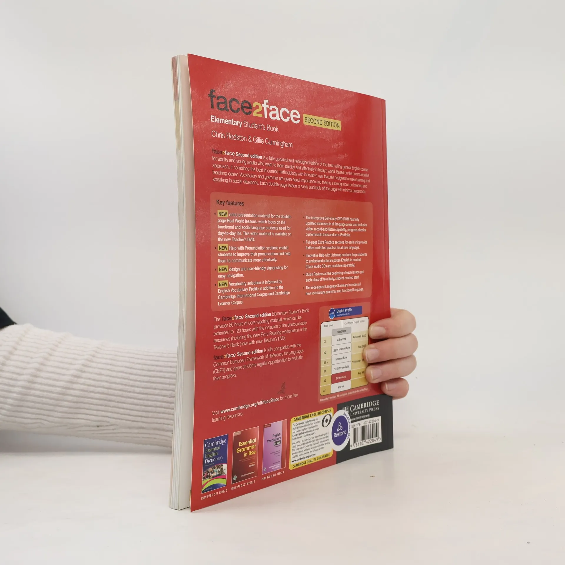 face2face is the flexible, easy-to-teach General English course that helps adults and young adults to speak and listen with confidence. face2face is informed by Cambridge English Corpus and its vocabulary syllabus has been mapped to the English Vocabulary Profile, meaning students learn the language they really need at each CEFR level. The course improves students' listening skills by drawing their attention to the elements of spoken English that are difficult to understand.