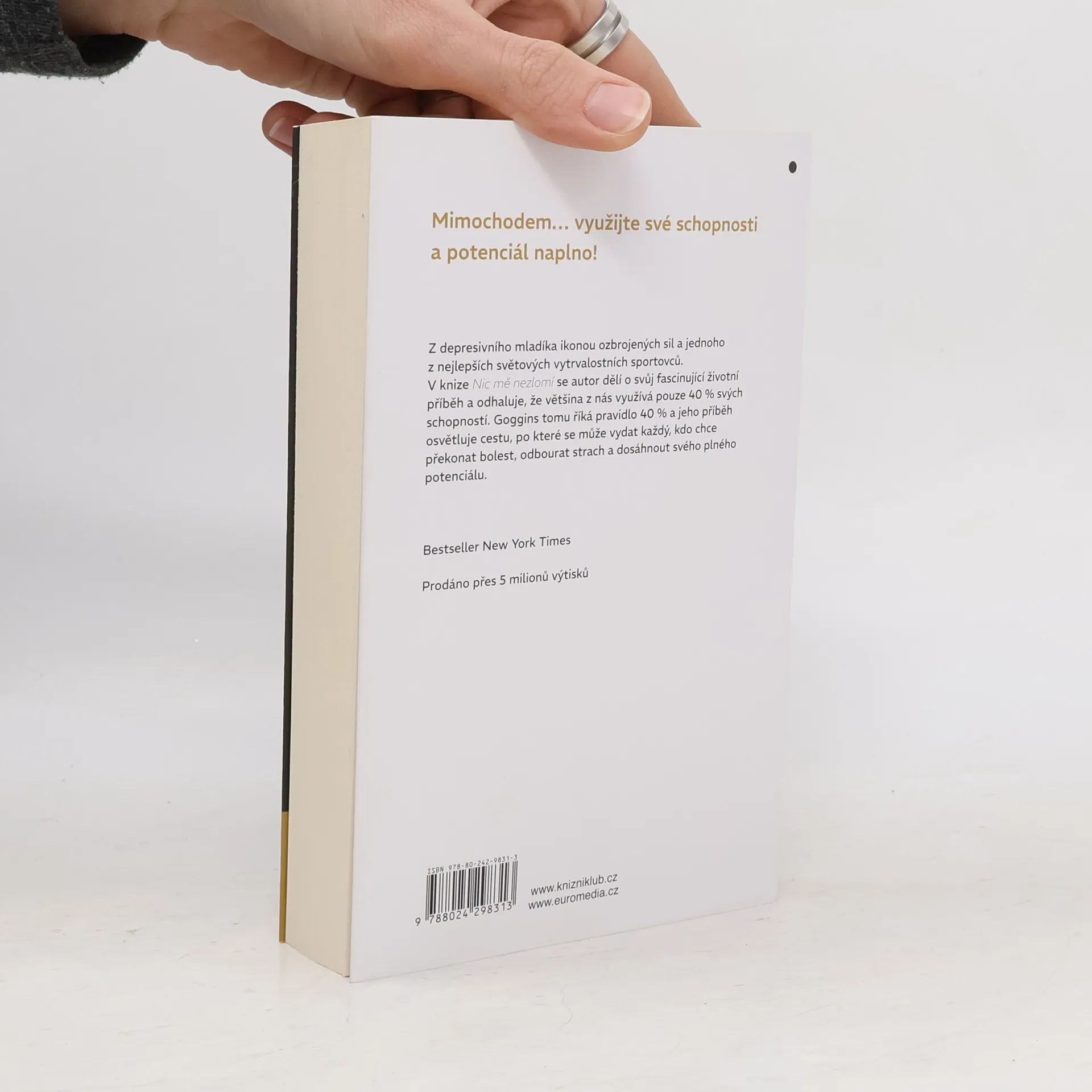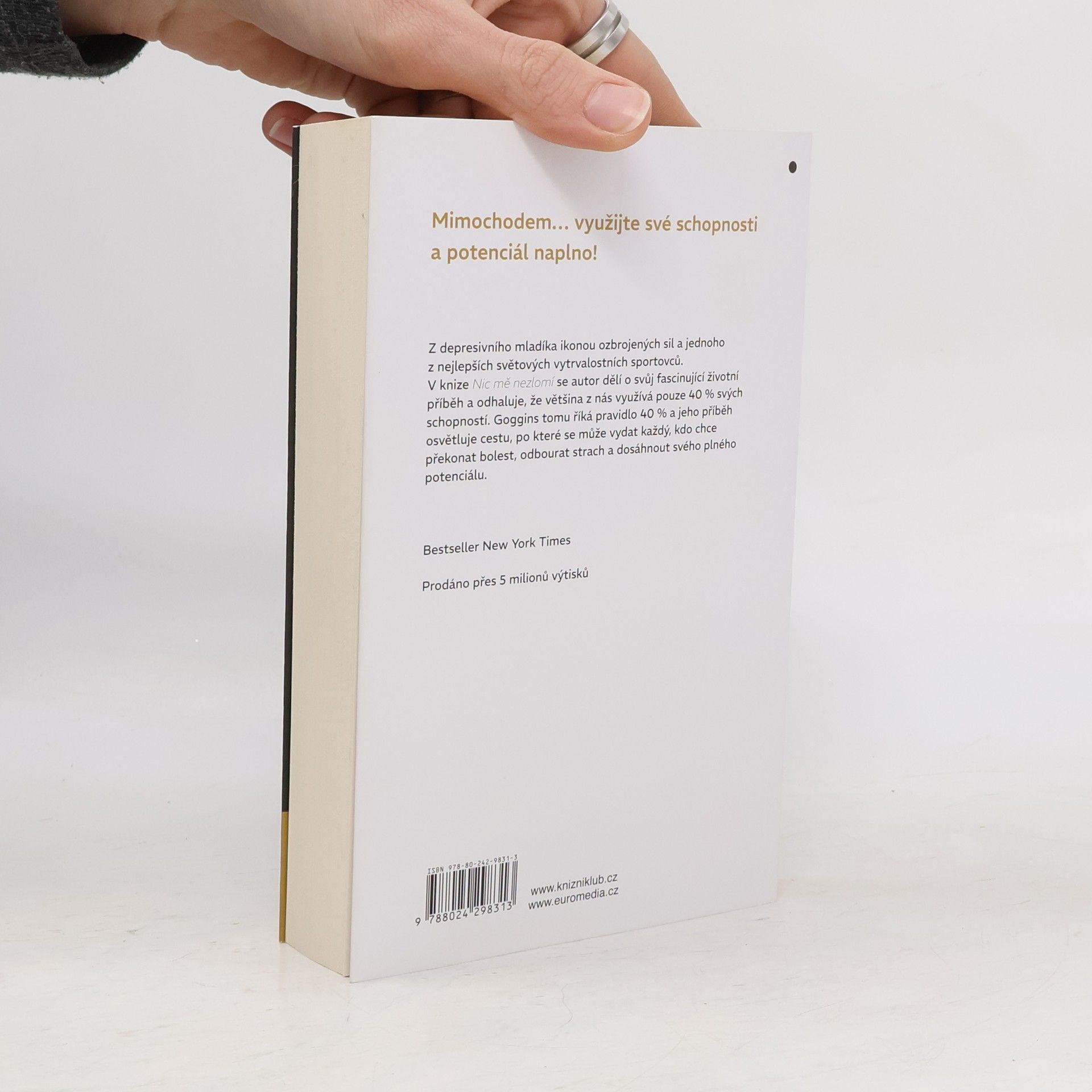 Dětství Davida Gogginse bylo noční můrou - chudoba, předsudky a fyzické týrání ho velmi poznamenaly. Díky sebekázni, psychické odolnosti a tvrdé práci se však Goggins proměnil z depresivního mladíka s nadváhou v ikonu amerických ozbrojených sil a jednoho z nejlepších světových vytrvalostních sportovců. Jako jediný muž v historii absolvoval elitní výcvik příslušníka Navy SEAL, armádního rangera a taktického leteckého dispečera, dále vytvořil rekordy v mnoha vytrvalostních závodech a časopis Outside ho označil za nejzdatnějšího muže v Americe. V knize Nic mě nezlomí se dělí o svůj fascinující životní příběh a odhaluje, že většina z nás využívá pouze 40 % svých schopností. Goggins tomu říká pravidlo 40 % a jeho příběh osvětluje cestu, po které se může vydat každý, kdo chce překonat bolest, odbourat strach a dosáhnout svého plného potenciálu. Bestseller New York Times. Prodáno přes 5 milionů výtisků