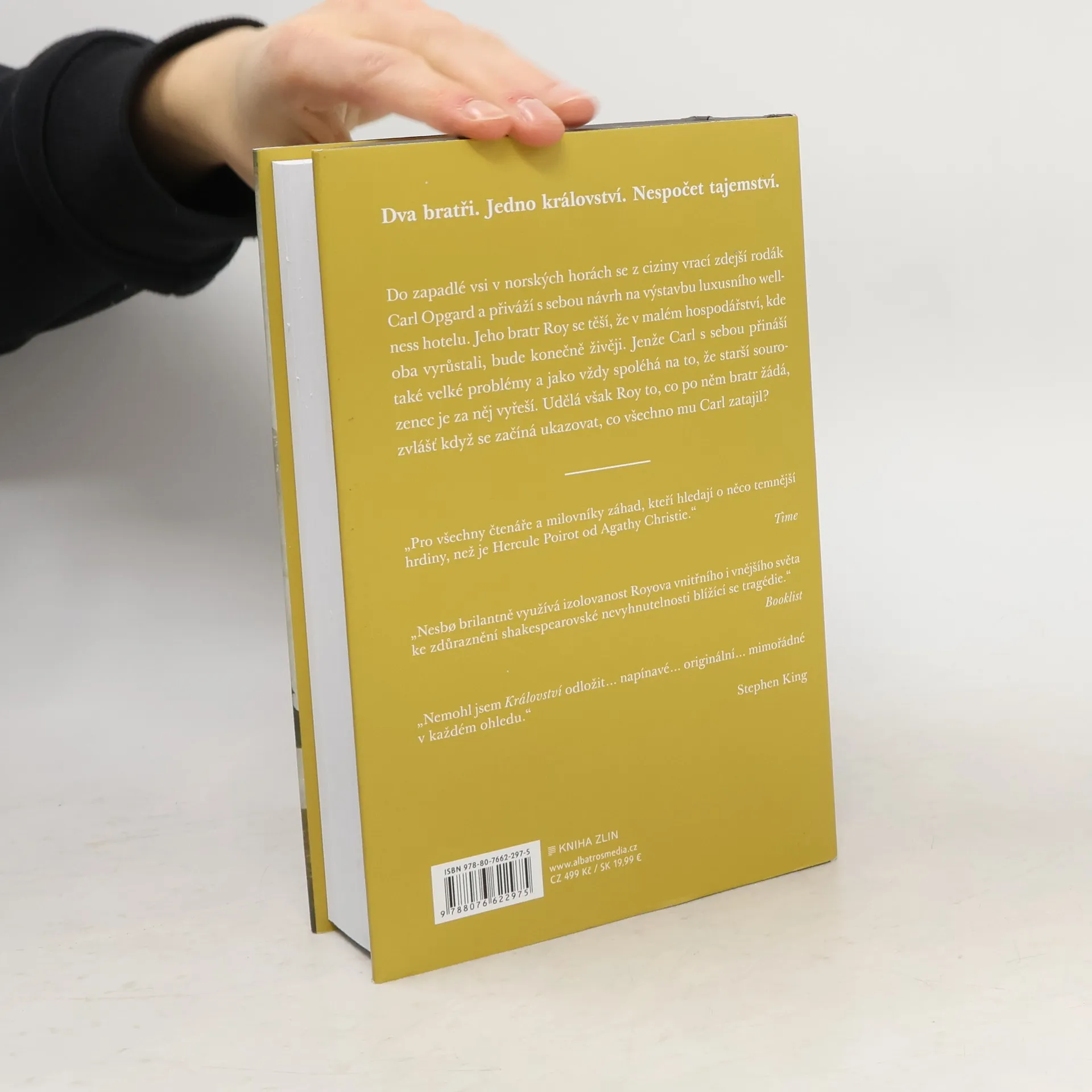 Dva bratři. Jedno království. Nespočet tajemství. Do zapadlé vsi v norských horách se z ciziny vrací zdejší rodák Carl Opgard se svou barbadoskou manželkou Shannon a přiváží s sebou návrh na výstavbu luxusního wellness hotelu. Jeho bratr Roy, který ve vsi provozuje benzínovou pumpu, se těší, že v malém hospodářství, kde po smrti rodičů oba vyrůstali, bude konečně živěji. Jenže Carl s sebou přináší také velké problémy a jako vždy spoléhá na to, že starší sourozenec je za něj vyřeší. Udělá však Roy to, co po něm bratr žádá, zvlášť když se začíná ukazovat, co všechno mu Carl zatajil? „Pro všechny čtenáře a milovníky záhad, kteří hledají o něco temnější hrdiny, než je Hercule Poirot od Agathy Christie.“ Time „Nesbo brilantně využívá izolovanost Royova vnitřního i vnějšího světa ke zdůraznění shakespearovské nevyhnutelnosti blížící se tragédie.“ Booklist „Nemohl jsem Království odložit… napínavé… originální… mimořádné v každém ohledu.“ Stephen King