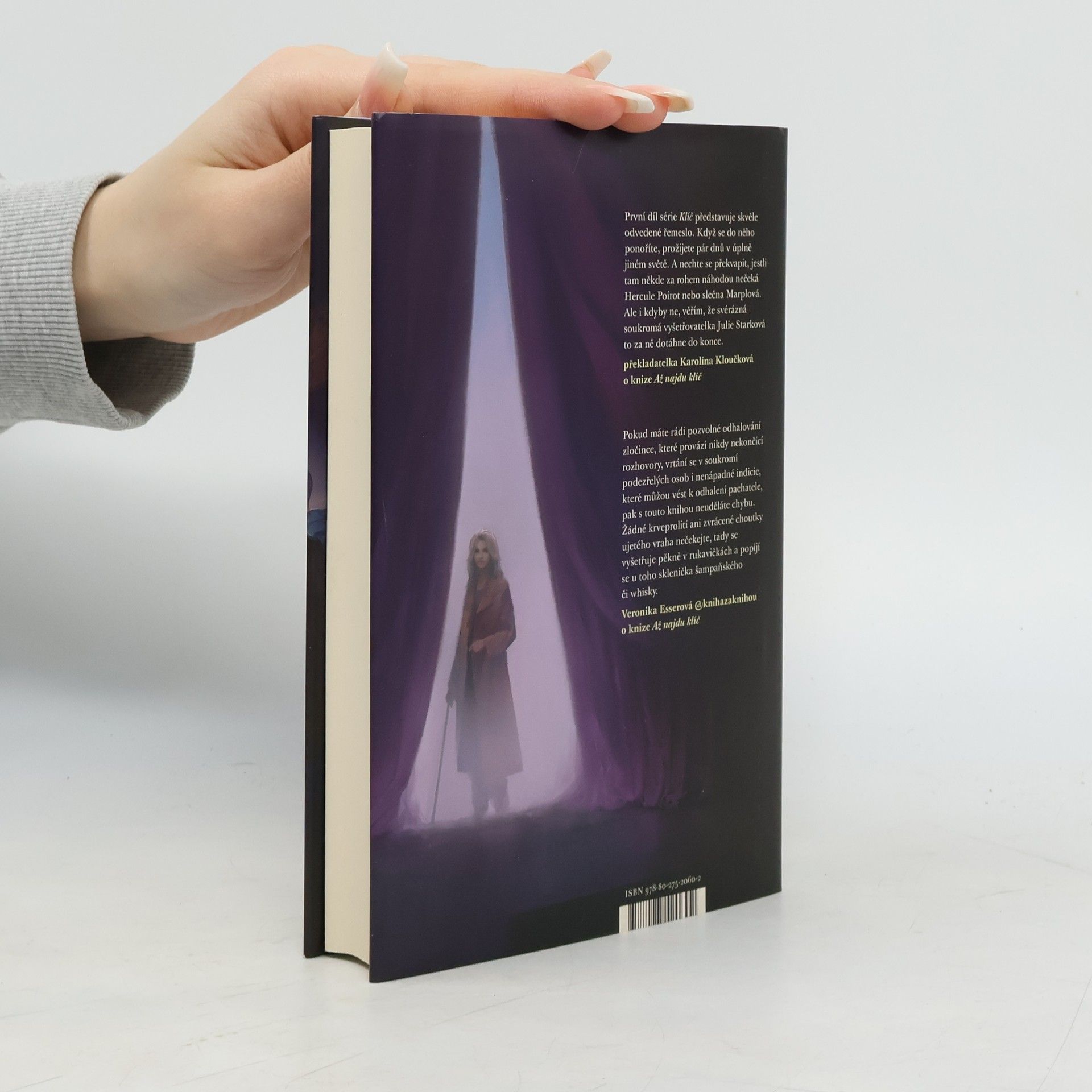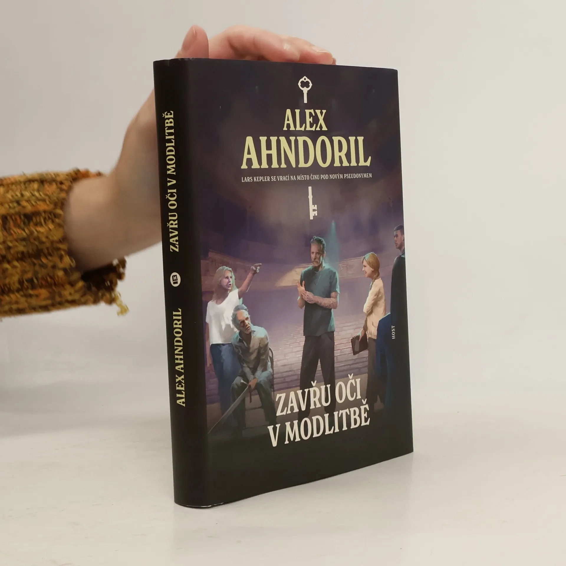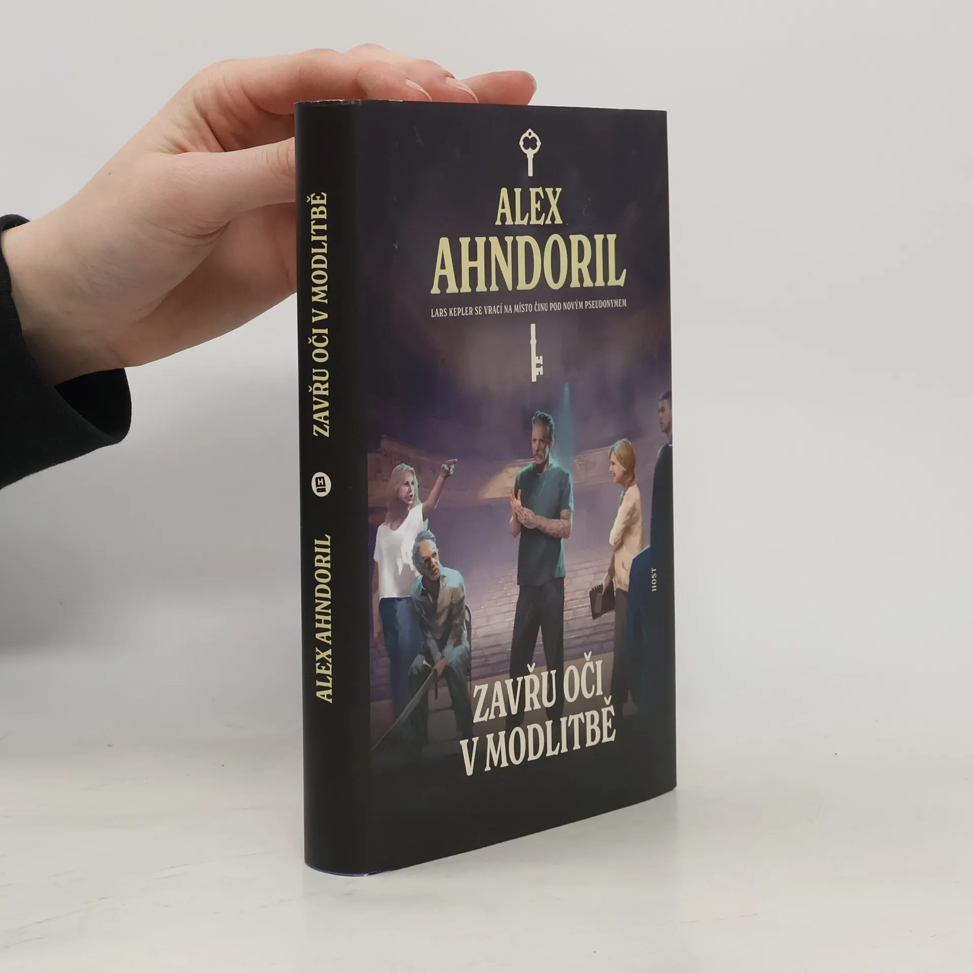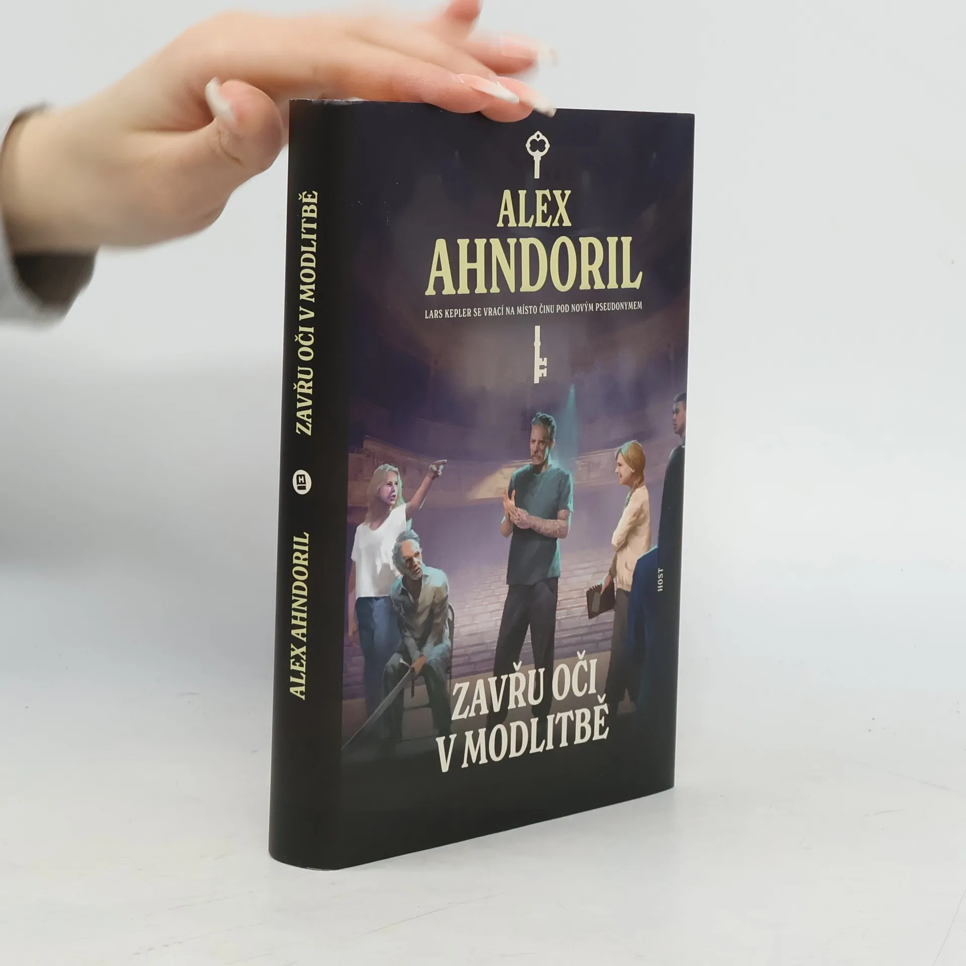 Julie Starková tentokrát na prknech, která znamenají svět. Do kanceláře Julie Starkové přichází zoufalá herečka Bianca Salová, kterou podle jejího tvrzení pronásleduje její mrtvý snoubenec. Předešlou noc se Bianca probudila a uviděla ho ve své ložnici a několik dní předtím se údajně vloupal do její šatny v Činoherním divadle a zapálil jí šaty. Její snoubenec však tragicky zahynul před sedmi lety, právě když Bianca zkoušela hlavní ženskou roli v tragédii Macbeth v Královském činoherním divadle. Bianca se přímo na jevišti zhroutila a celé představení muselo být zrušeno. Nyní dostal divadelní soubor šanci hru inscenovat znovu a během zkoušek se začaly dít ony nevysvětlitelné návštěvy. Julie Starková se hereččina případu ujme. Doprovází Biancu na zkoušky a proniká do dynamiky divadelního prostředí. Zdá se, že stalker se pohybuje přímo v souboru. Téměř nikdo z herců nemá pro incidenty alibi a napětí před premiérou roste. Julie zároveň požádá svého bývalého manžela Sidneyho, aby vyšetřil nejasnosti kolem úmrtí Biančina snoubence. K vyřešení tohoto záhadného případu bude muset Julie zapojit všechny své psychologické instinkty, pozorovací schopnosti a logické myšlení. Zavřu oči v modlitbě je druhým dílem série Klíč od Alexe Ahndorila, autorské dvojice, která stojí za Larsem Keplerem.