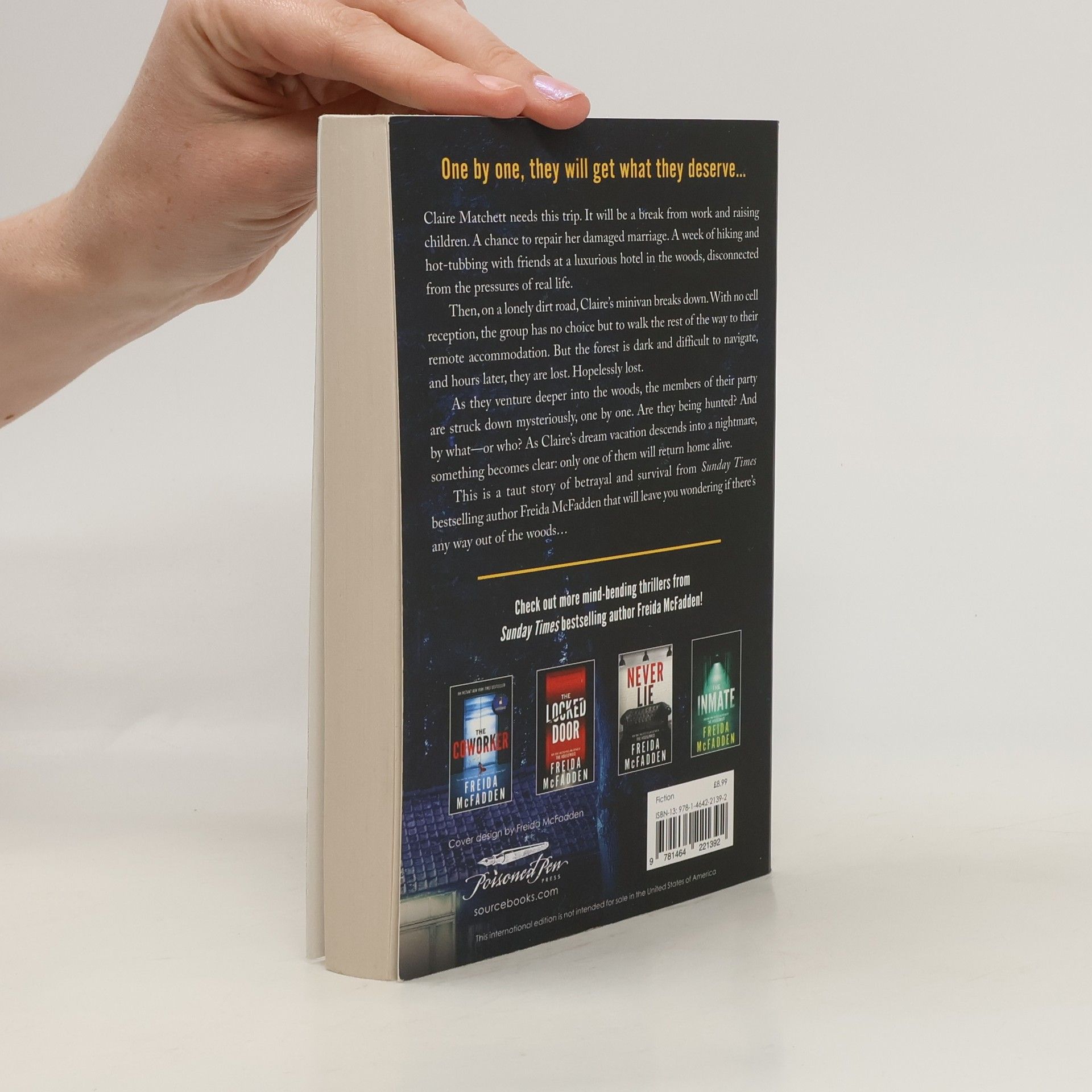 From New York Times bestselling author Freida McFadden comes a dark, twisting thriller about a group of friends lost in the woods- one by one, they each will fall, and only the killer will return home alive... A night spent sleeping on dirt and leaves is not how Claire Matchett expected to spend her vacation. She thought this would be a break from the stresses of work and raising her young children. A chance to repair her damaged marriage. A week of hiking and hot tubs with friends. It sounded like heaven. Then Claire's minivan breaks down on a lonely dirt road. With no cell reception, the group has no choice but to hike the rest of the way to their hotel. But it turns out the woods aren't as easy to navigate as they thought. Hours later, they are lost. Hopelessly lost. And as they navigate deeper into the woods, the members of their party are struck down mysteriously one by one. Has a wild animal been hunting them? Or is the hunter one of them? But as more time passes, one thing becomes clear- Only one of them will return home alive.