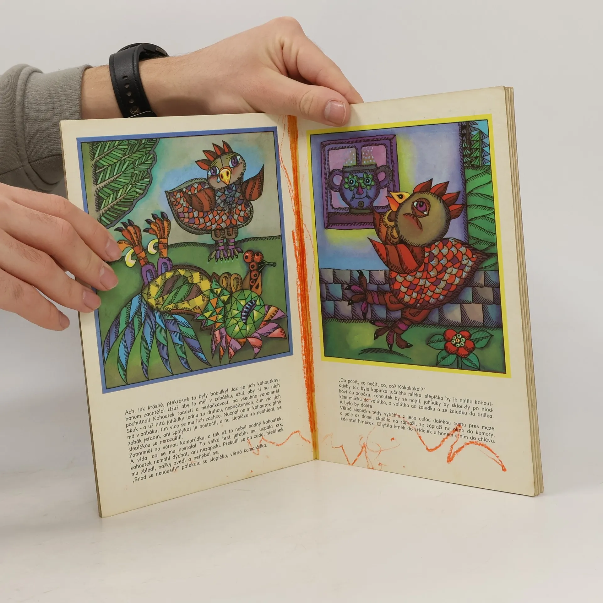 Národní umělkyně Marie Majerová vypráví v poněkud pozměněné a zkrácené formě národní pohádku o slepičce, která svou obětavostí zachrání před zadušením svého kohoutka.