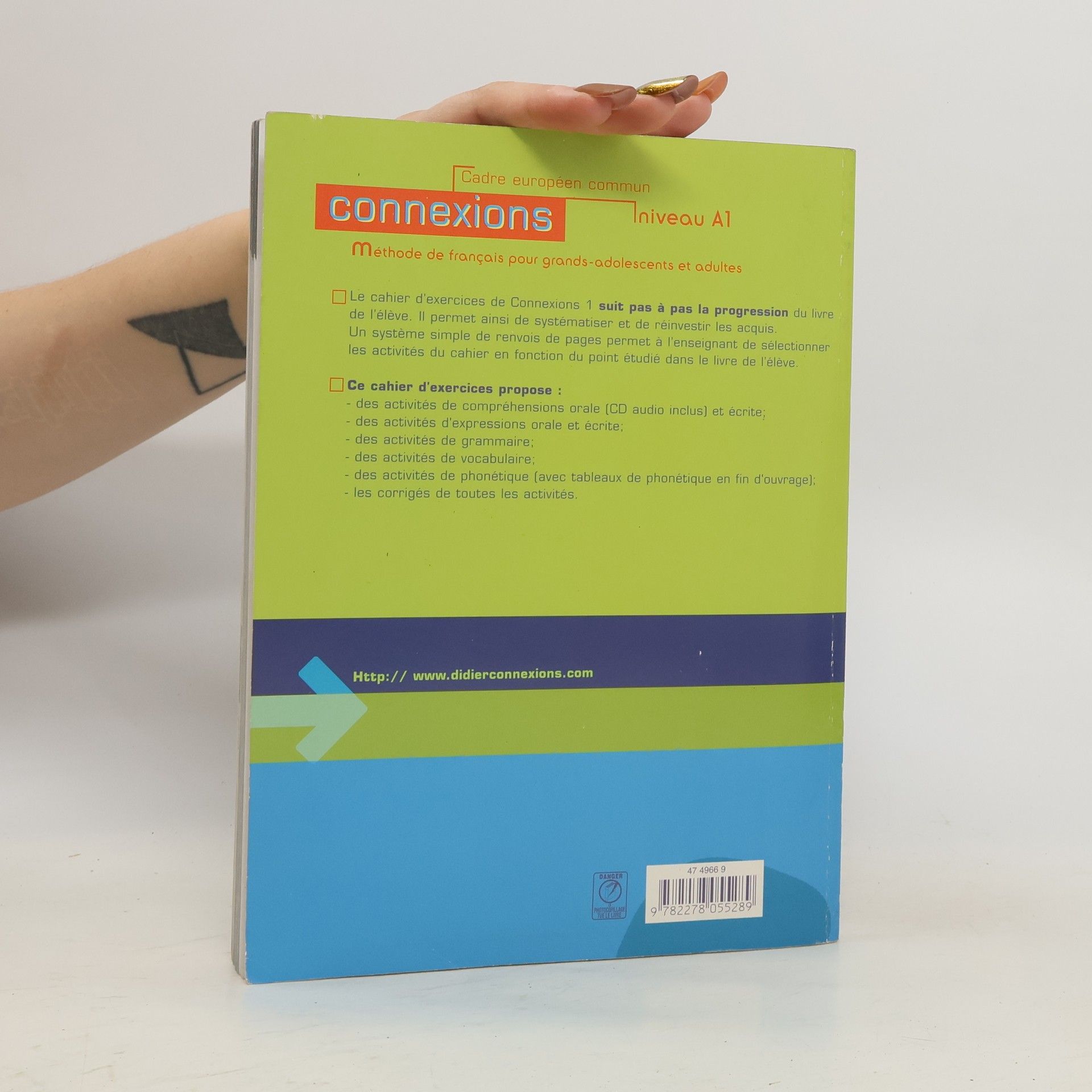 Méthode de français pour grands-adolescents et adultes. Le cahier d'exercices de Connexions 1 suit pas à pas la progression du livre de l'élève. Il permet ainsi de systématiser et de réinvestir les acquis. Un système simple de renvois de pages permet à l'enseignant de sélectionner les activités du cahier en fonction du point étudié dans le livre de l'élève. Ce cahier d'exercices propose : des activités de compréhensions orale (CD audio inclus) et écrite ; des activités d'expressions orale et écrite ; des activités de grammaire ; des activités de vocabulaire ; des activités de phonétique (avec tableaux de phonétique en fin d'ouvrage) ; les corrigés de toutes les activités.