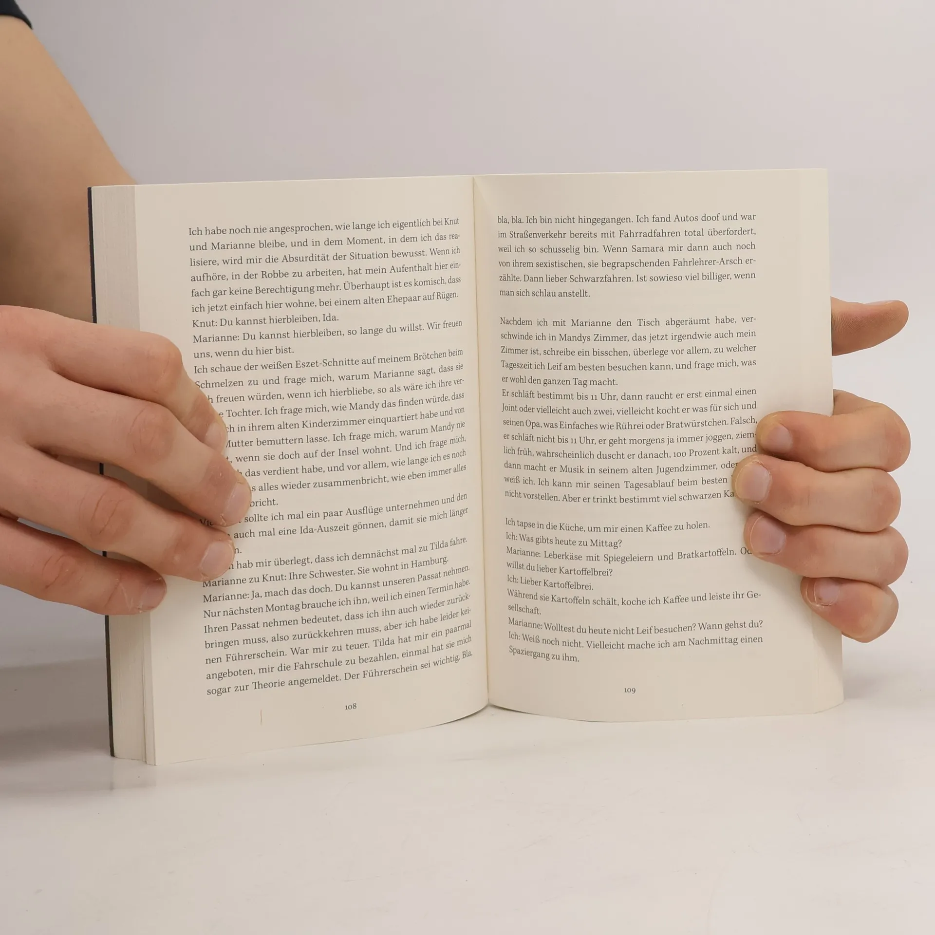 Ida hat nichts bei sich außer dem alten, verschrammten Hartschalenkoffer ihrer Mutter, ein paar Lieblingsklamotten und ihrem MacBook, als sie ihr Zuhause verlässt. Es ist wahrscheinlich ein Abschied für immer von der Kleinstadt, in der sie ihr ganzes bisheriges Leben verbracht hat. Im Abschiednehmen ist Ida richtig schlecht; sie hat es vor zwei Monaten nicht einmal auf die Beerdigung ihrer Mutter geschafft. Am Bahnhof sucht sie sich den Zug aus, der am weitesten wegfährt – auf keinen Fall will sie zu ihrer Schwester Tilda nach Hamburg –, und landet auf Rügen. Ohne Plan, nur mit einem großen Klumpen aus Wut, Trauer und Schuld im Bauch, streift sie über die Ostseeinsel. Und trifft schließlich auf Knut, den örtlichen Kneipenbesitzer, und seine Frau Marianne, die Ida kurzerhand bei sich aufnehmen. Zu dritt frühstücken sie jeden Morgen Aufbackbrötchen, den Tag verbringt Ida dann mit Marianne, sie walken gemeinsam durch den Wald oder spielen Skip-Bo, abends arbeitet Ida mit Knut in der »Robbe«. Und sie lernt Leif kennen, der ähnlich versehrt ist wie sie. Auf einmal ist alles ein bisschen leichter, erträglicher in Idas Leben. Bis ihre Welt kurz darauf wieder aus den Angeln gehoben wird.