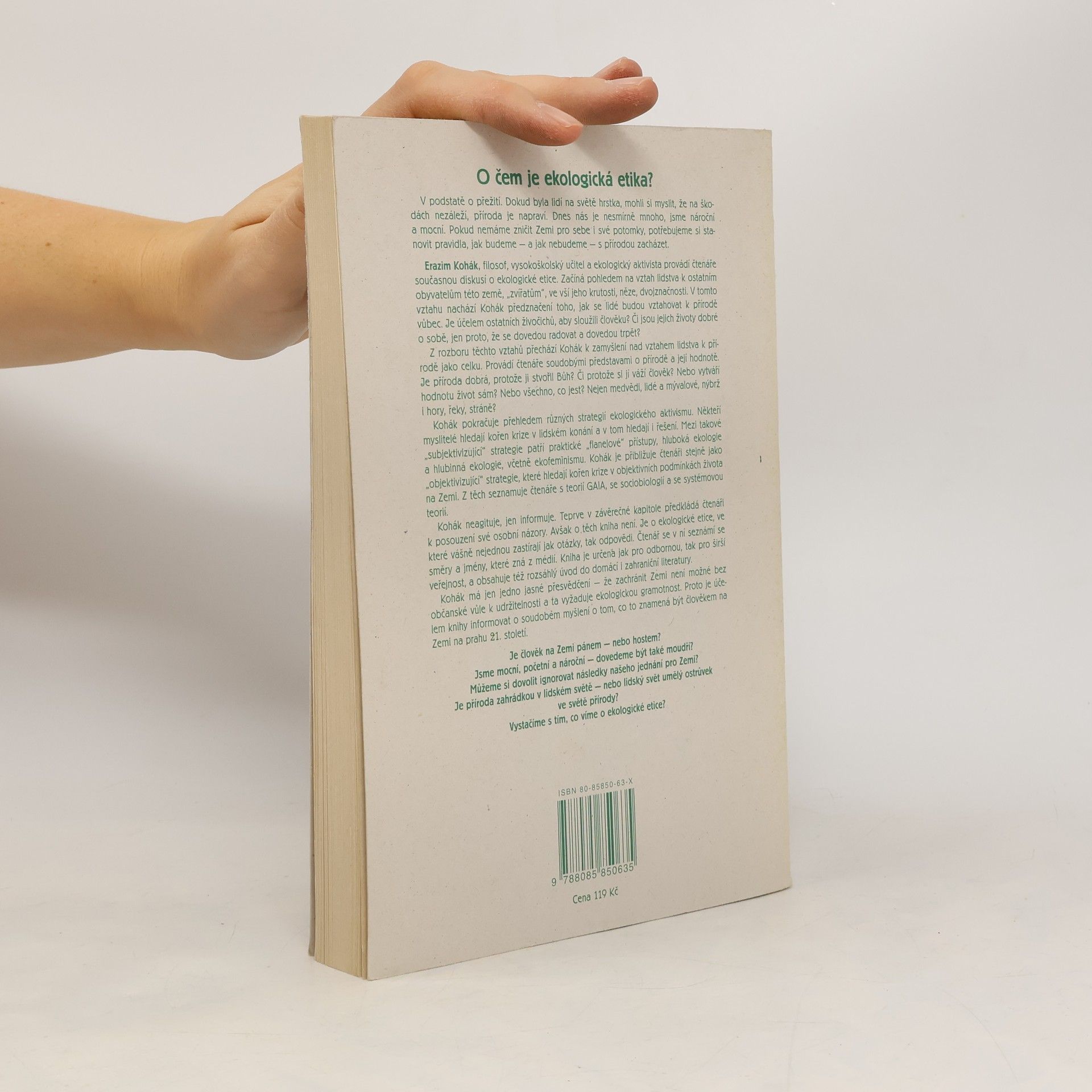 Autor (filosof, vysokoškolský učitel a ekologický aktivista) provádí čtenáře současnou diskusí o ekologické etice. Začíná pohledem na vztah lidstva k ostatním obyvatelům této země, "zvířatům", a od jeho rozboru přechází k zamyšlení nad vztahem lidstva k přírodě jako celku. Provádí čtenáře soudobými představami o přírodě a její hodnotě, poté pokračuje přehledem různých strategií ekologického aktivismu, a to jak "subjektivizujících", tak "objektivizujících". Druhé přepracované vydání.