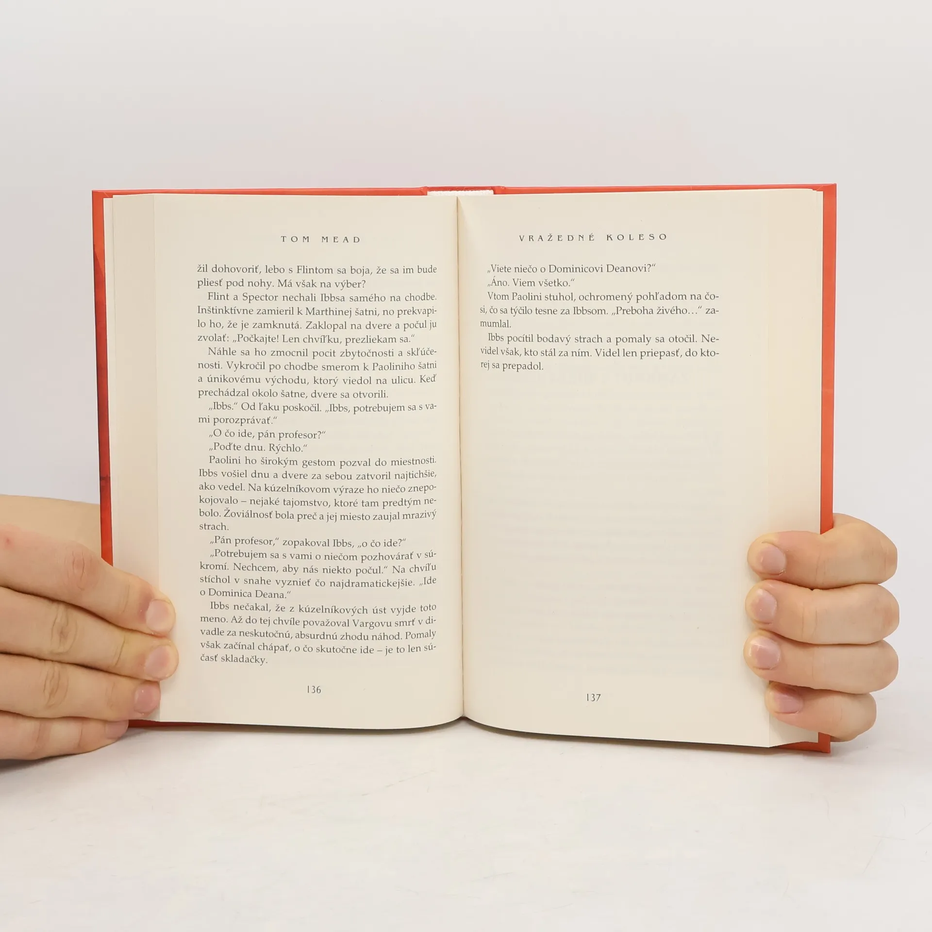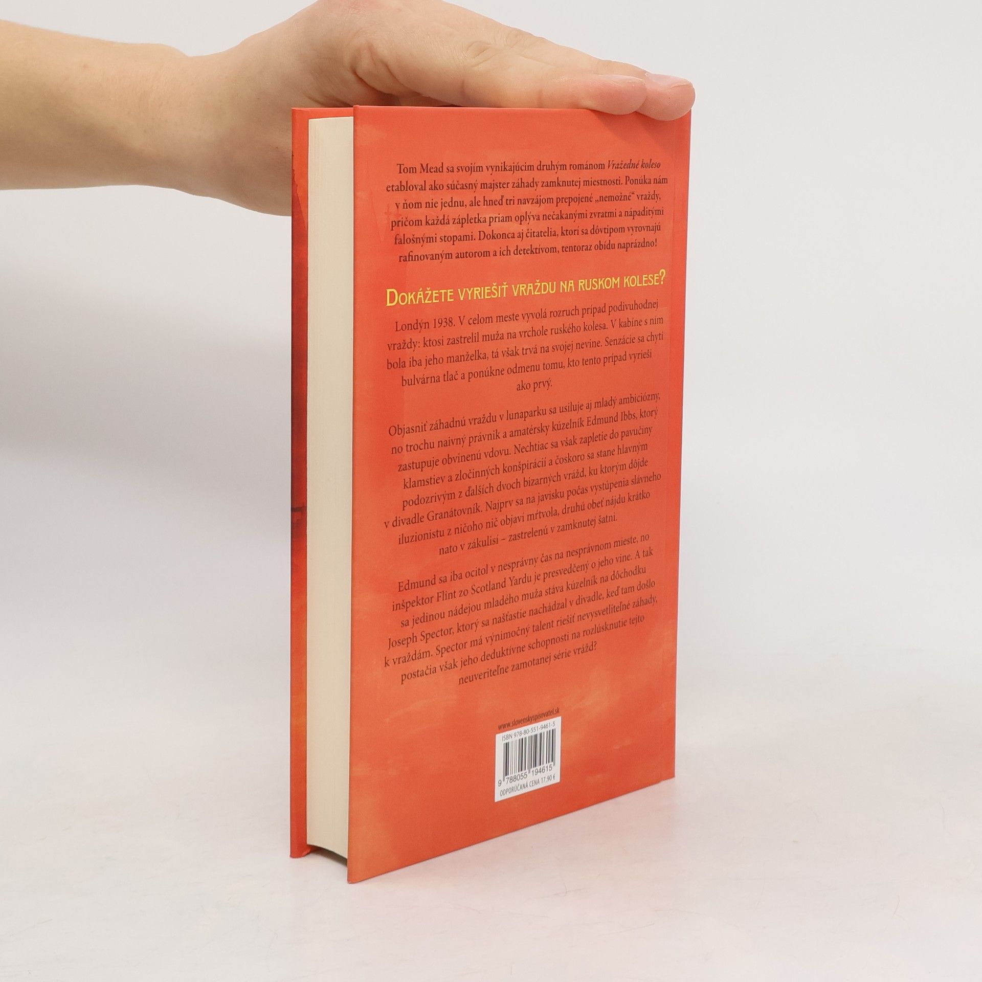 Tom Mead sa svojím vynikajúcim druhým románom Vražedné koleso etabloval ako súčasný majster záhady zamknutej miestnosti. Ponúka nám v ňom nie jednu, ale hneď tri navzájom prepojené „nemožné“ vraždy, pričom každá zápletka priam oplýva nečakanými zvratmi a nápaditými falošnými stopami. Dokonca aj čitatelia, ktorí sa dôvtipom vyrovnajú rafinovaným autorom a ich detektívom, tentoraz obídu naprázdno! Dokážete vyriešiť vraždu na ruskom kolese? Londýn 1938. V celom meste vyvolá rozruch prípad podivuhodnej vraždy: ktosi zastrelil muža na vrchole ruského kolesa. V kabíne s ním bola iba jeho manželka, tá však trvá na svojej nevine. Senzácie sa chytí bulvárna tlač a ponúkne odmenu tomu, kto tento prípad vyrieši ako prvý. Objasniť záhadnú vraždu v lunaparku sa usiluje aj mladý ambiciózny, no trochu naivný právnik a amatérsky kúzelník Edmund Ibbs, ktorý zastupuje obvinenú vdovu. Nechtiac sa však zapletie do pavučiny klamstiev a zločinných konšpirácií a čoskoro sa stane hlavným podozrivým z ďalších dvoch bizarných vrážd, ku ktorým dôjde v divadle Granátovník. Najprv sa na javisku počas vystúpenia slávneho iluzionistu z ničoho nič objaví mŕtvola, druhú obeť nájdu krátko nato v zákulisí - zastrelenú v zamknutej šatni. Edmund sa iba ocitol v nesprávny čas na nesprávnom mieste, no inšpektor Flint zo Scotland Yardu je presvedčený o jeho vine. A tak sa jedinou nádejou mladého muža stáva kúzelník na dôchodku Joseph Spector, ktorý sa našťastie nachádzal v divadle, keď tam došlo k vraždám. Spector má výnimočný talent riešiť nevysvetliteľné záhady, postačia však jeho deduktívne schopnosti na rozlúsknutie tejto neuveriteľne zamotanej série vrážd?