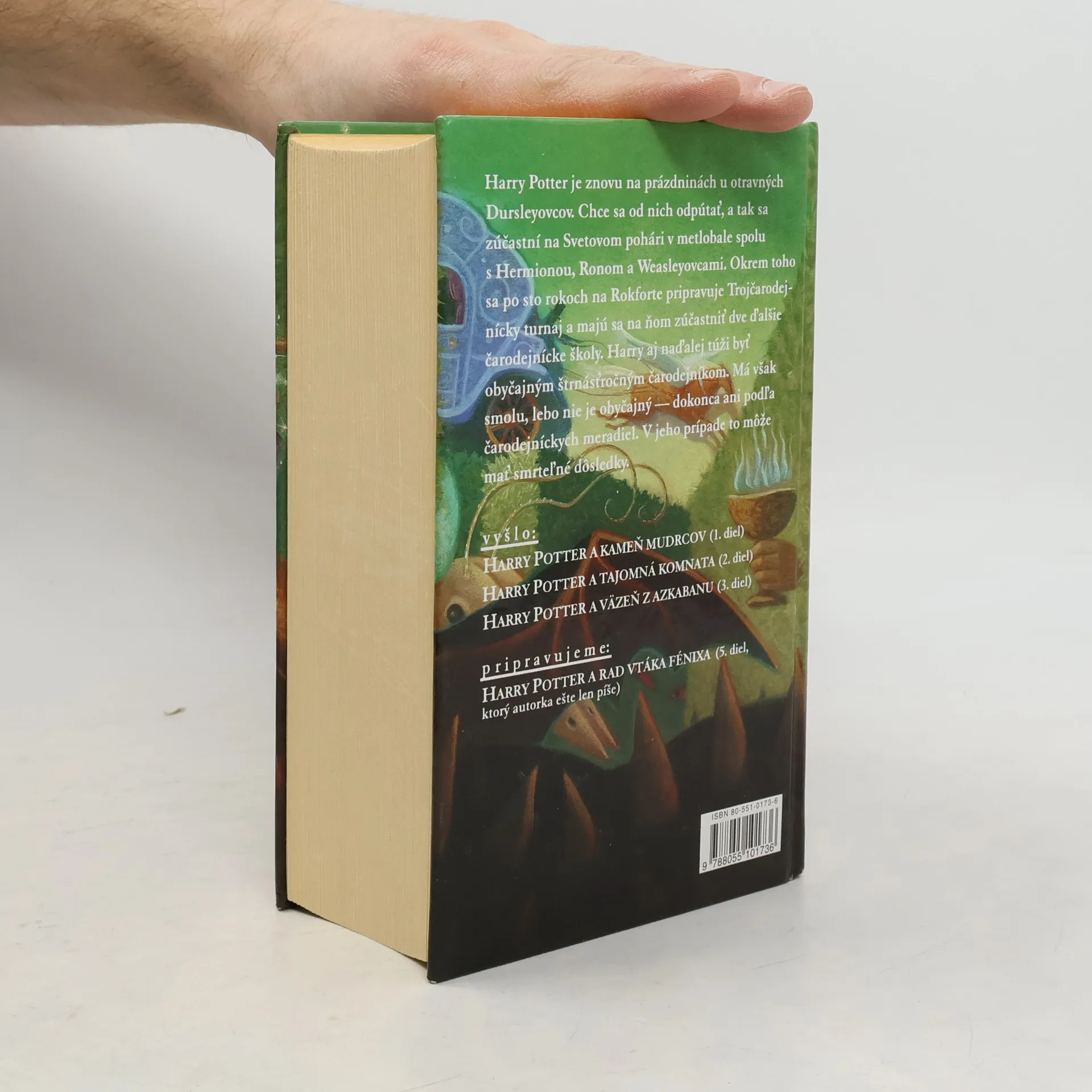 Harry Potter je znovu na prázdninách u otravných Dursleyovcov. Chce sa od nich odpútať, a tak sa zúčastní na Svetovom pohári v metlobale spolu s Hermionou, Ronom a Weasleyovcami. Okrem toho sa po sto rokoch na Rokforte pripravuje Trojčarodejnícky turnaj a majú sa na ňom zúčastniť dve ďalšie čarodejnícke školy. Harry aj naďalej túži byť obyčajným štrnásťročným čarodejníkom. Má však smolu, lebo nie je obyčajný - dokonca ani podľa čarodejníckych meradiel. V jeho prípade to môže mať smrteľné dôsledky...