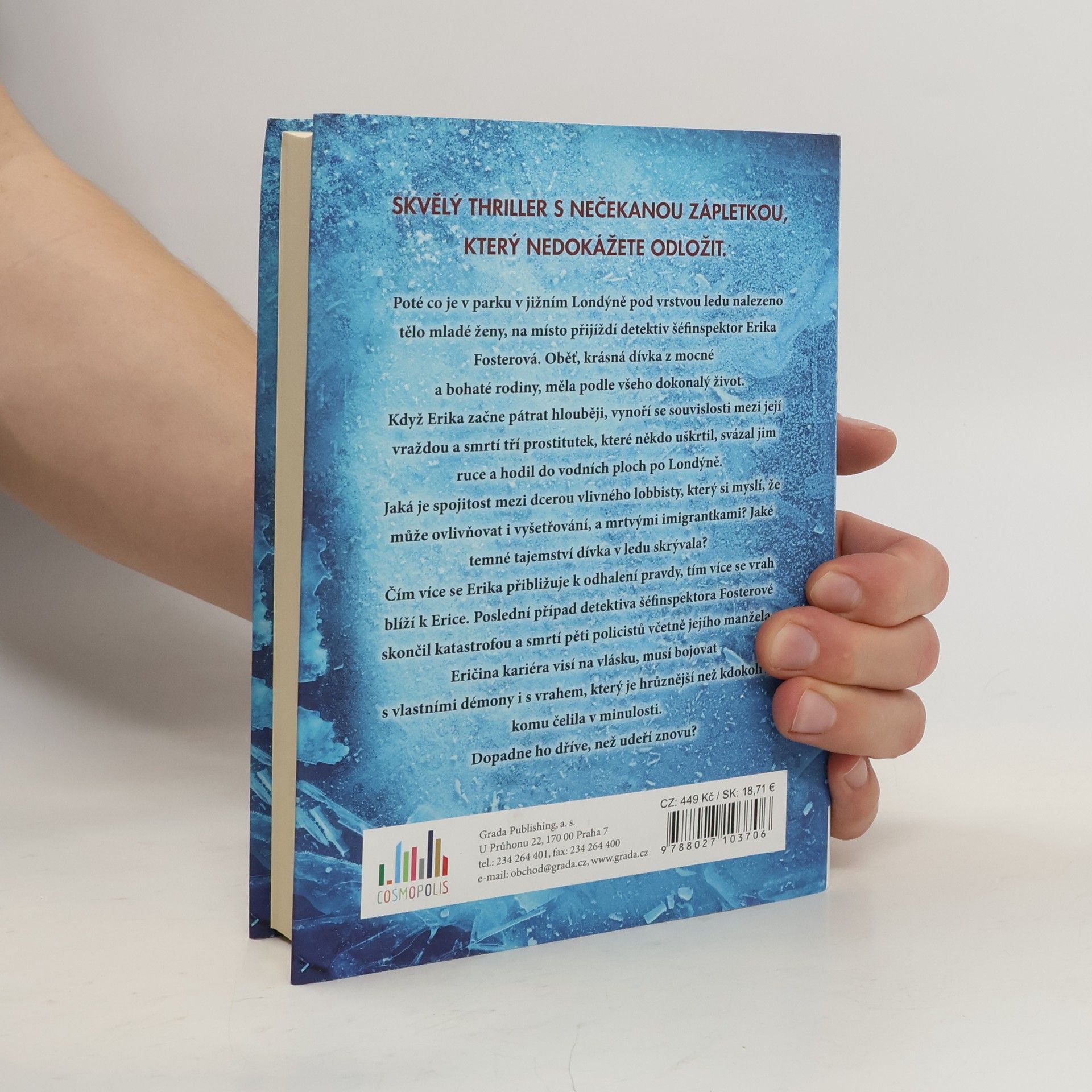 Poté co je v parku v jižním Londýně pod vrstvou ledu nalezeno tělo mladé ženy, na místo přijíždí detektiv šéfinspektor Erika Fosterová. Oběť, krásná dívka z mocné a bohaté rodiny, měla podle všeho dokonalý život. Když Erika začne pátrat hlouběji, vynoří se souvislosti mezi její vraždou a smrtí tří prostitutek, které někdo uškrtil, svázal jim ruce a hodil do vodních ploch po Londýně. Jaká je spojitost mezi dcerou vlivného lobbisty, který si myslí, že může ovlivňovat i vyšetřování, a mrtvými imigrantkami? Jaké temné tajemství dívka v ledu skrývala? Čím více se Erika přibližuje k odhalení pravdy, tím více se vrah blíží k Erice. Poslední případ detektiva šéfinspektora Fosterové skončil katastrofou a smrtí pěti policistů včetně jejího manžela. Eričina kariéra visí na vlásku, musí bojovat s vlastními démony i s vrahem, který je hrůznější než kdokoliv, komu čelila v minulosti. Dopadne ho dříve, než udeří znovu?