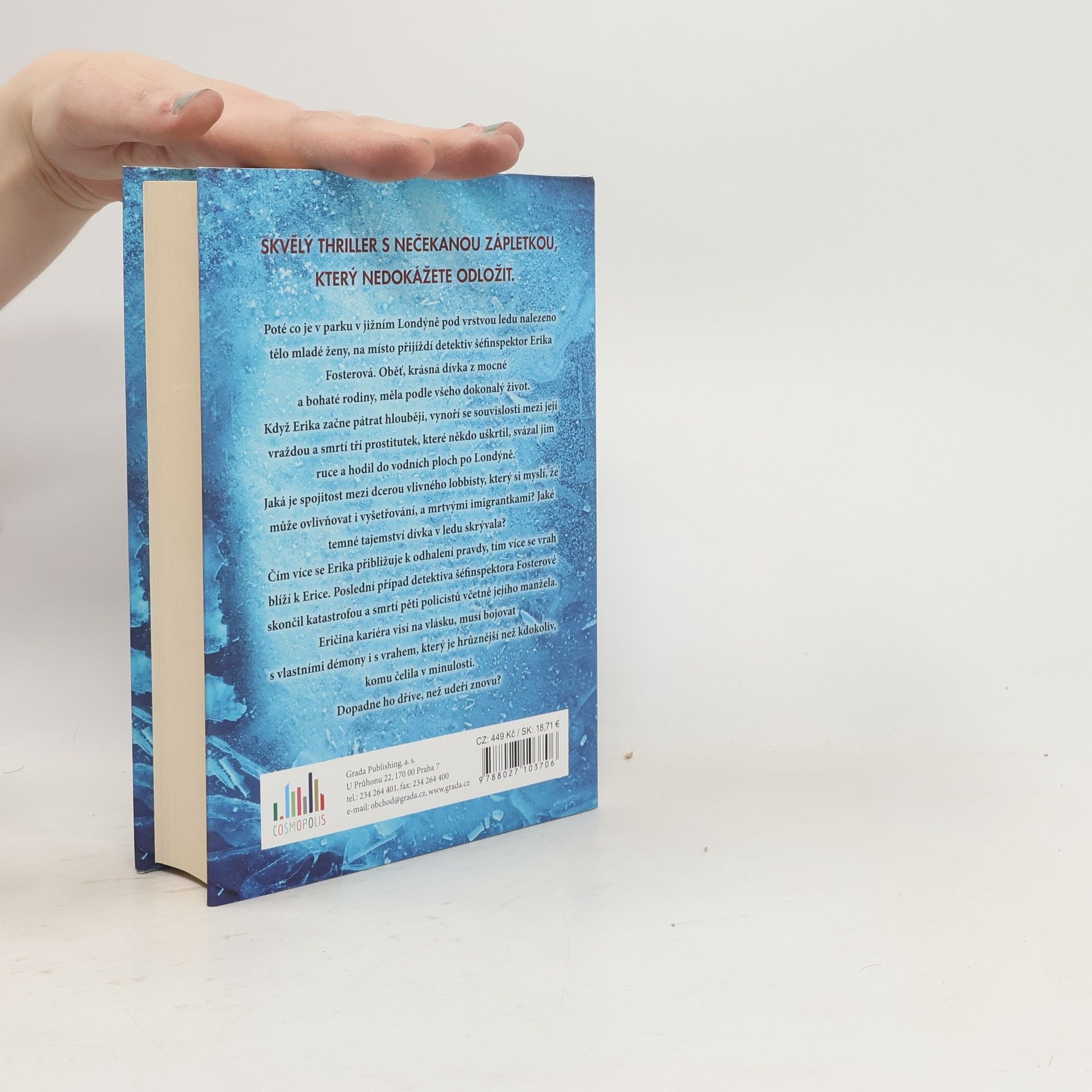 Poté co je v parku v jižním Londýně pod vrstvou ledu nalezeno tělo mladé ženy, na místo přijíždí detektiv šéfinspektor Erika Fosterová. Oběť, krásná dívka z mocné a bohaté rodiny, měla podle všeho dokonalý život. Když Erika začne pátrat hlouběji, vynoří se souvislosti mezi její vraždou a smrtí tří prostitutek, které někdo uškrtil, svázal jim ruce a hodil do vodních ploch po Londýně. Jaká je spojitost mezi dcerou vlivného lobbisty, který si myslí, že může ovlivňovat i vyšetřování, a mrtvými imigrantkami? Jaké temné tajemství dívka v ledu skrývala? Čím více se Erika přibližuje k odhalení pravdy, tím více se vrah blíží k Erice. Poslední případ detektiva šéfinspektora Fosterové skončil katastrofou a smrtí pěti policistů včetně jejího manžela. Eričina kariéra visí na vlásku, musí bojovat s vlastními démony i s vrahem, který je hrůznější než kdokoliv, komu čelila v minulosti. Dopadne ho dříve, než udeří znovu?