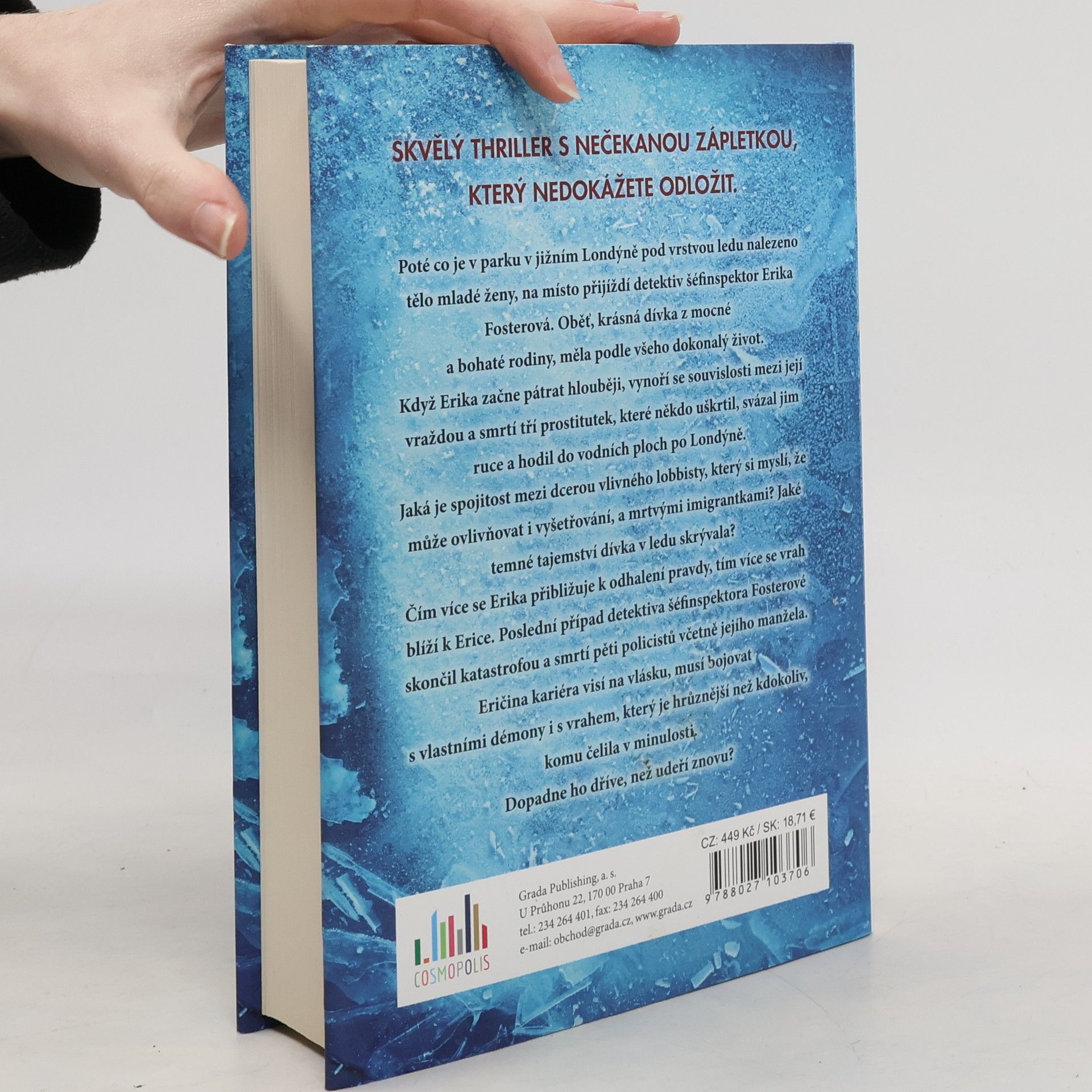 Poté co je v parku v jižním Londýně pod vrstvou ledu nalezeno tělo mladé ženy, na místo přijíždí detektiv šéfinspektor Erika Fosterová. Oběť, krásná dívka z mocné a bohaté rodiny, měla podle všeho dokonalý život. Když Erika začne pátrat hlouběji, vynoří se souvislosti mezi její vraždou a smrtí tří prostitutek, které někdo uškrtil, svázal jim ruce a hodil do vodních ploch po Londýně. Jaká je spojitost mezi dcerou vlivného lobbisty, který si myslí, že může ovlivňovat i vyšetřování, a mrtvými imigrantkami? Jaké temné tajemství dívka v ledu skrývala? Čím více se Erika přibližuje k odhalení pravdy, tím více se vrah blíží k Erice. Poslední případ detektiva šéfinspektora Fosterové skončil katastrofou a smrtí pěti policistů včetně jejího manžela. Eričina kariéra visí na vlásku, musí bojovat s vlastními démony i s vrahem, který je hrůznější než kdokoliv, komu čelila v minulosti. Dopadne ho dříve, než udeří znovu?
