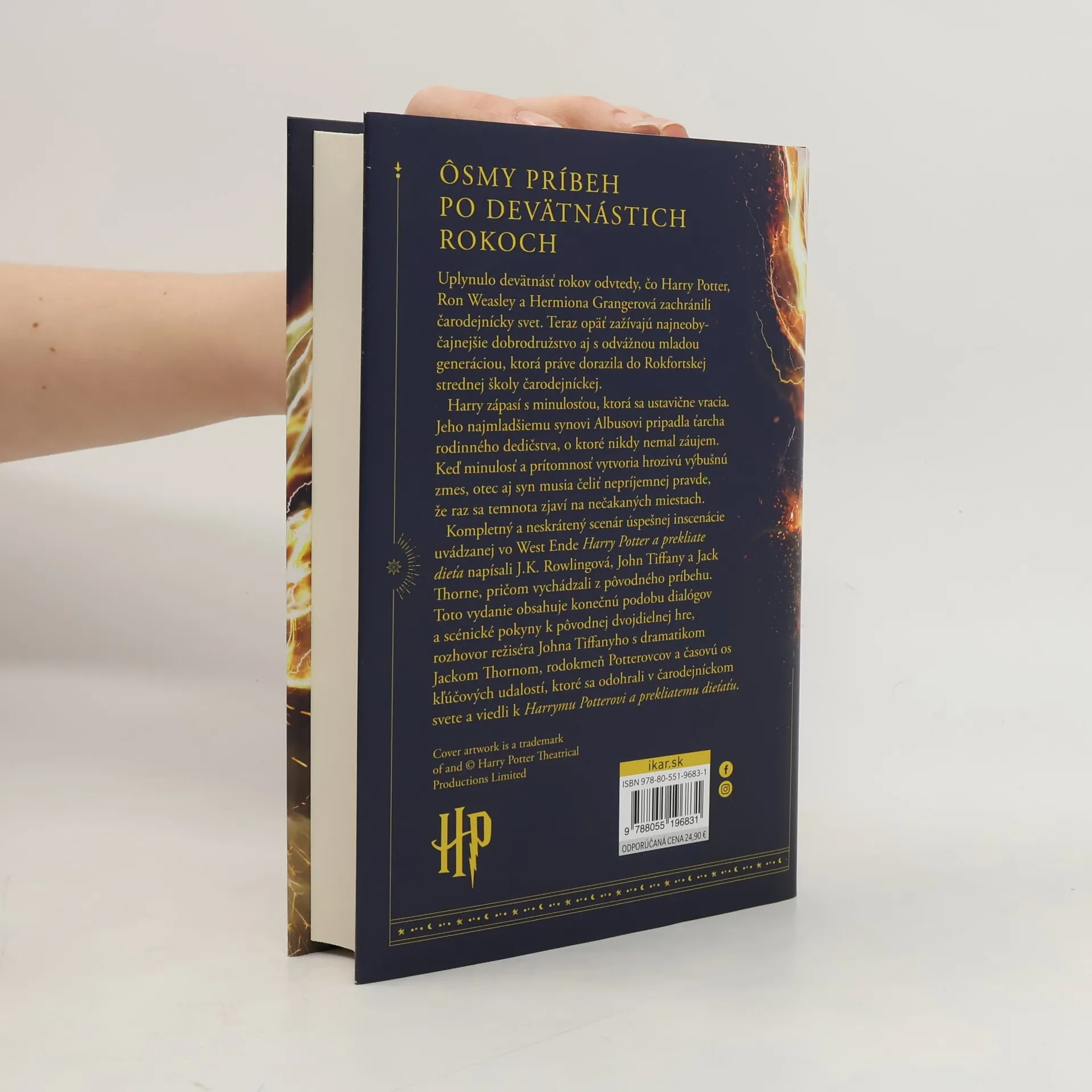 Vždy bolo ťažké byť Harrym Potterom a nie je to ľahké ani dnes, keď je prepracovaným zamestnancom Ministerstva mágie, manželom a otcom troch školopovinných detí. Harry zápasí s minulosťou, ktorá sa ustavične vracia. Jeho najmladšiemu synovi Albusovi pripadla ťarcha rodinného dedičstva, o ktoré nikdy nemal záujem. Keď minulosť a prítomnosť vytvoria hrozivú výbušnú zmes, otec aj syn musia čeliť nepríjemnej pravde, že raz sa temnota zjaví na nečakaných miestach. Nová hra Jacka Thorna Harry Potter a prekliate dieťa vychádza z pôvodného nového príbehu J.K. Rowlingovej, Johna Tiffanyho a Jacka Thorna. Je to ôsmy príbeh o Harrym Potterovi a prvý, ktorý sa objavil na javisku.