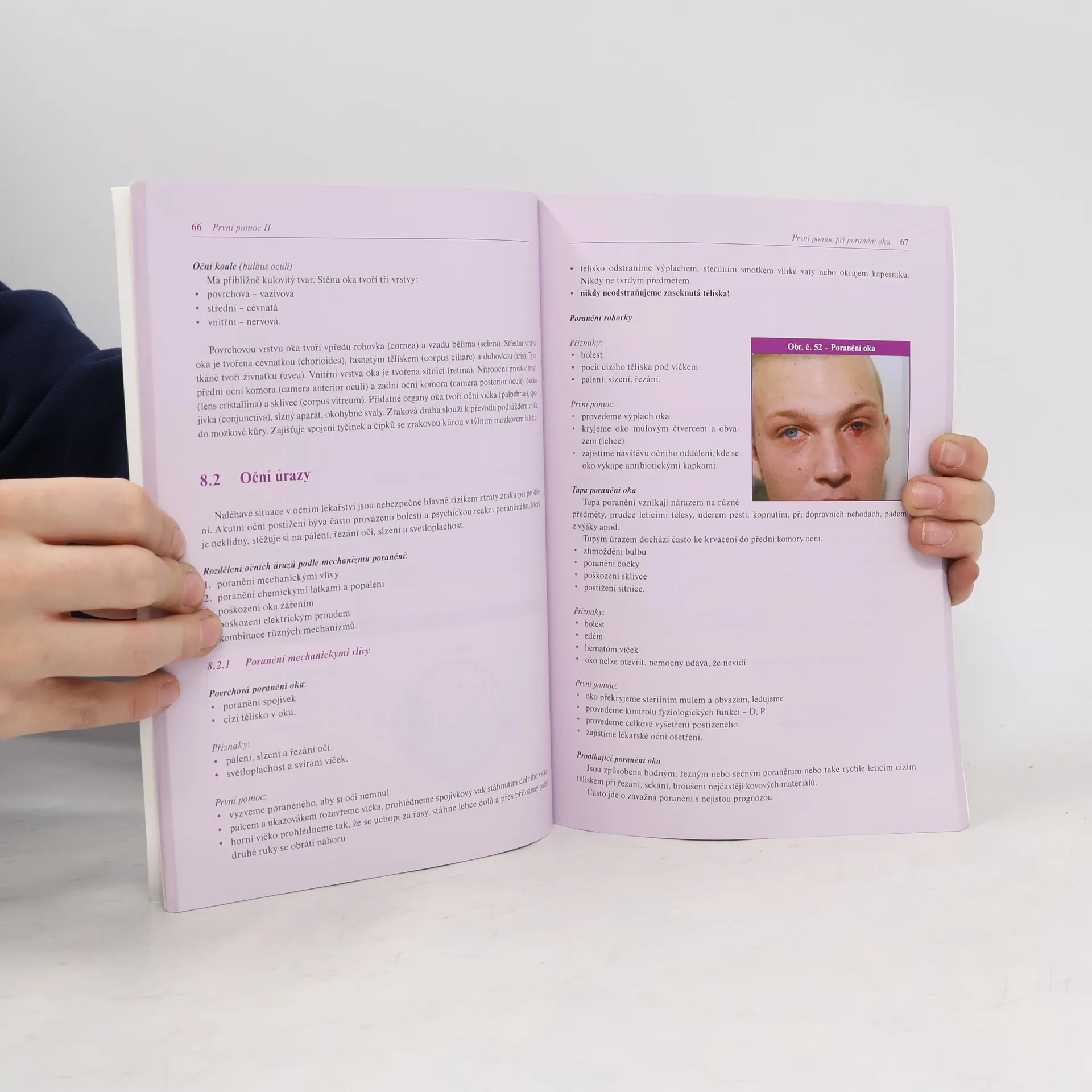 Nová, moderní učebnice jednoduchým a přehledným způsobem seznamuje studenty zdravotnických oborů i účastníky kurzů první pomoci s principy základní a rozšířené první pomoci. Kniha, která je doplněna modelovými úlohami, bohatou fotografickou dokumentací i kreslenými obrázky, naučí studenty rychle a kvalitně zachránit lidský život, ošetřit postiženého v extrémních situacích i umět komunikovat s dispečinkem integrovaného záchranného systému. Publikace, která vychází ve dvou dílech, obsahuje také platné vyhlášky a normativy, které se dané problematiky týkají. První díl obsahuje obecné poznatky - od vybavení příruční lékárny přes obvazovou techniku, polohování a transport raněných, bezvědomí, křečové stavy až po ošetřování ran. V druhém díle jsou postupy nutné k vyhodnocení a ošetření úrazů podle jednotlivých tělních systémů.
