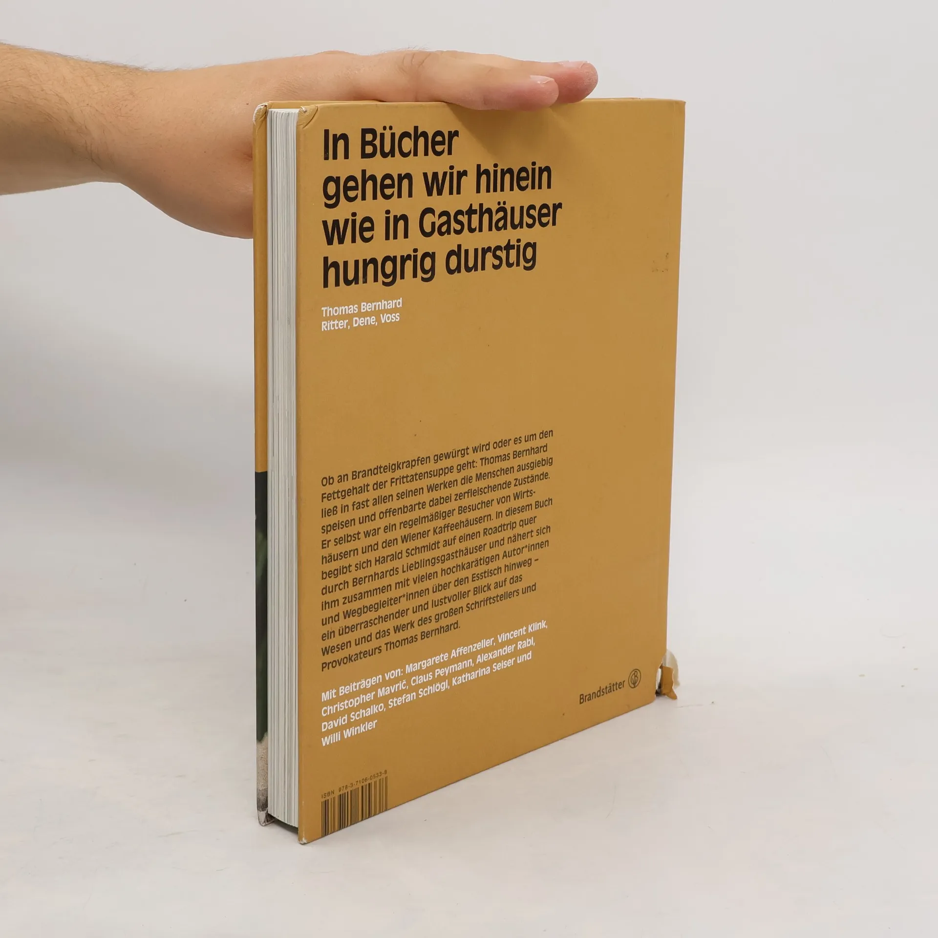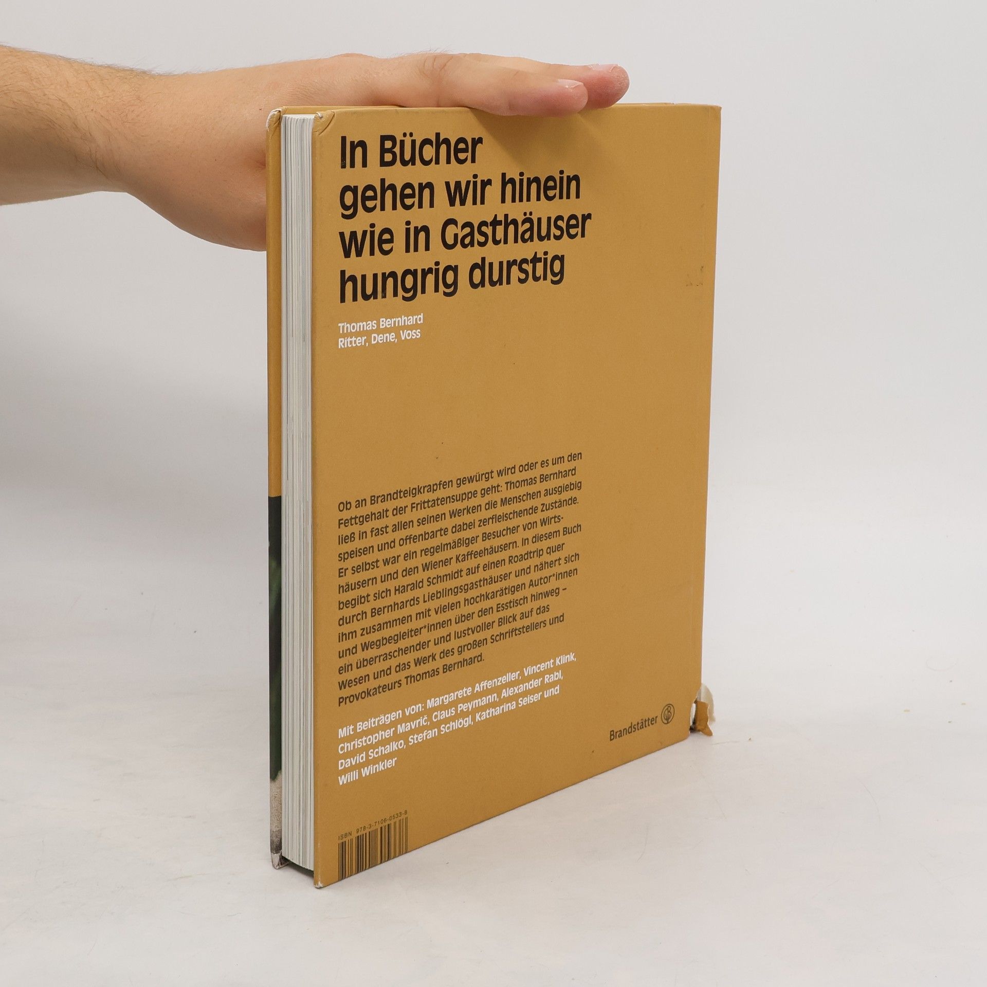 Ob an Brandteigkrapfen gewürgt wird oder es um den Fettgehalt der Frittatensuppe geht, Thomas Bernhard ließ in fast allen seinen Werken die Menschen ausgiebig speisen und offenbarte dabei zerfleischende Zustände. Er selbst war ein regelmäßiger Besucher von Wirtshäusern und den Wiener Kaffeehäusern. Wie lohnenswert und inspirierend es ist, sich Thomas Bernhards Werk und seiner Persönlichkeit über den Esstisch hinweg anzunähern, zeigt Harald Schmidt mit diesem Buch. Auf einem Roadtrip quer durch Bernhards Lieblingsgasthäuser und zusammen mit vielen hochkarätigen Autoren und Wegbegleitern hat er sich auf die kulinarischen Spuren von Thomas Bernhard begeben – gemeinsam entfalten sie einen überraschenden und lustvollen Blick auf das Wesen und das Werk von Thomas Bernhard.