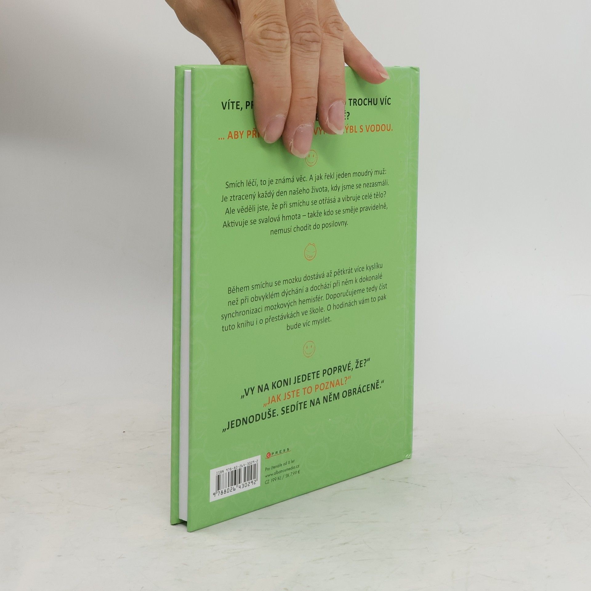 Tato kniha plná vtipů udělá radost všem. Ať už se začtete do vtipů o Pepíčkovi, ze školy, o prarodičích, z pohádek nebo dalších, pořádně se zasmějete a budete mít dobrou náladu. Věděli jste, že během smíchu se mozku dostává až 5 x více kyslíku než při obvyklém dýchání a dochází při něm k dokonalé synchronizaci mozkových hemisfér? Doporučujeme tedy číst tuto knihu i o přestávkách ve škole. O hodinách vám to pak bude víc myslet.