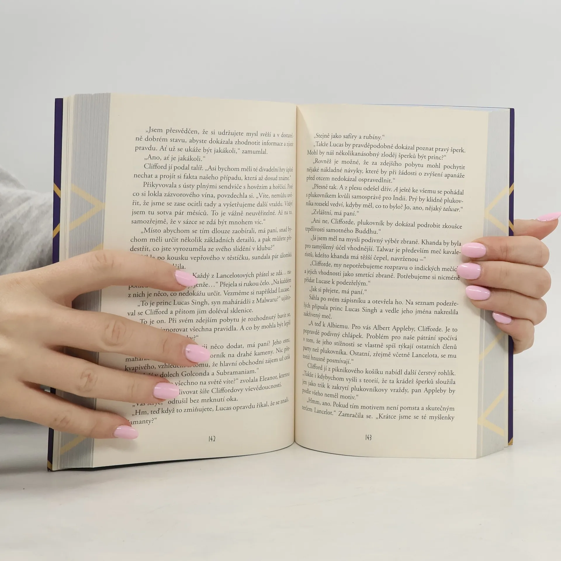 Detektivní román anglické autorské dvojice odehrávající se ve 20. letech 20. století. Na scénu opět vstupuje lady Eleanor Swiftová, amatérská vyšetřovatelka. Lady Eleanor Swiftová, pozoruhodná dobrodružka a amatérská vyšetřovatelka, si dává pauzu v pátrání. Má totiž mnohem větší problémy: Není moc zdatná tanečnice, nemá co na sebe a je očekávána na maškarním plese v sídle svého nového nápadníka Lance Langhama. Obklopená hosty v maskách a znepokojující spoustou peří pátrá po nějaké důvěrně známé tváři. Jak stoupá po hlavním schodišti za povědomým párem dlouhých nohou, nepochybuje, že kráčí za mužem svého srdce. Když však otevře dveře, spatří úděsný výjev: Lance stojí nad mrtvým plukovníkem Puddifootem, hrozivě máchá stříbrným svícnem a trezor zeje dokořán. Přesto Eleanor dospěje k přesvědčení, že její milý nic nespáchal, a zatímco je uvězněn, rozhodne se jeho jméno očistit. Nakladatelská anotace. Kráceno.