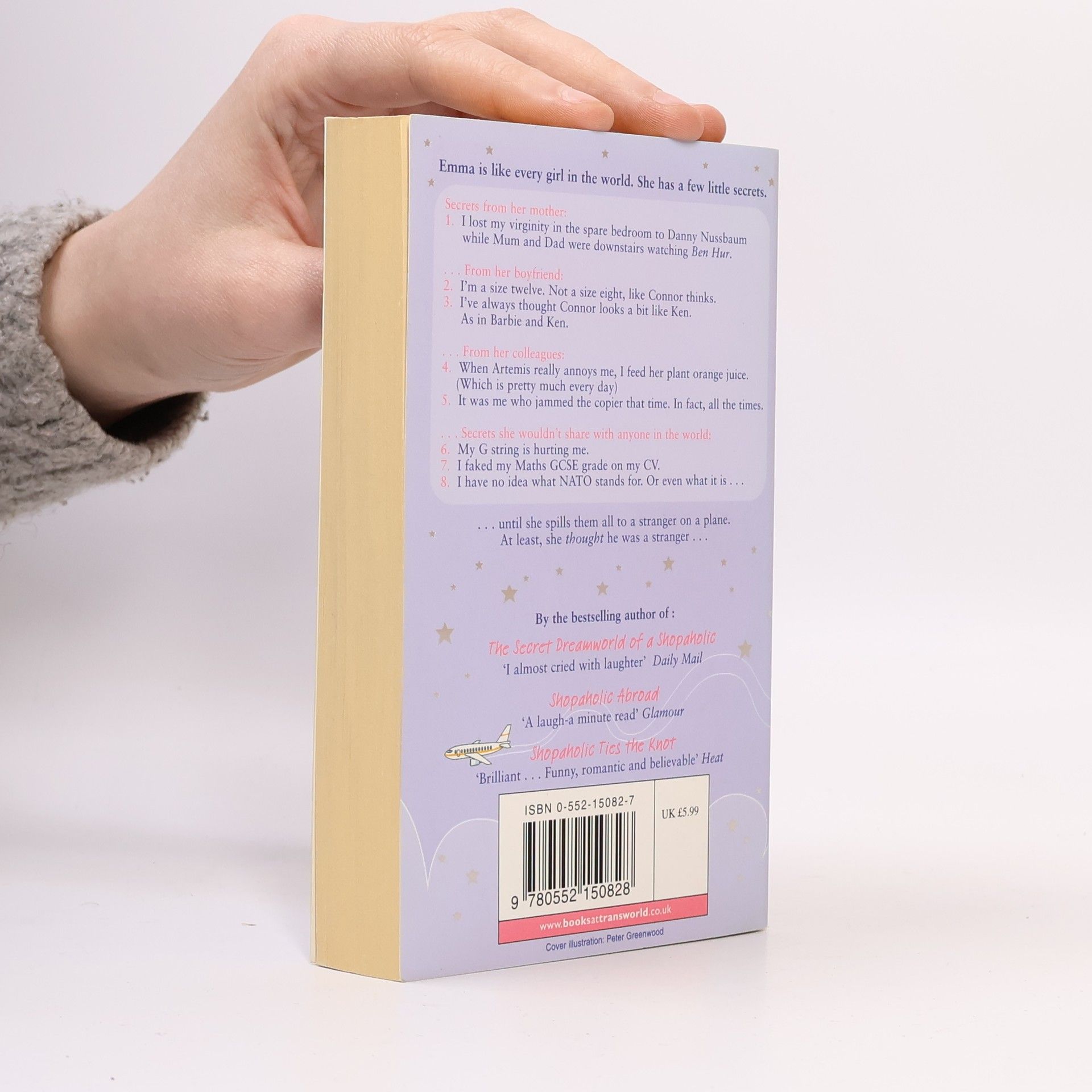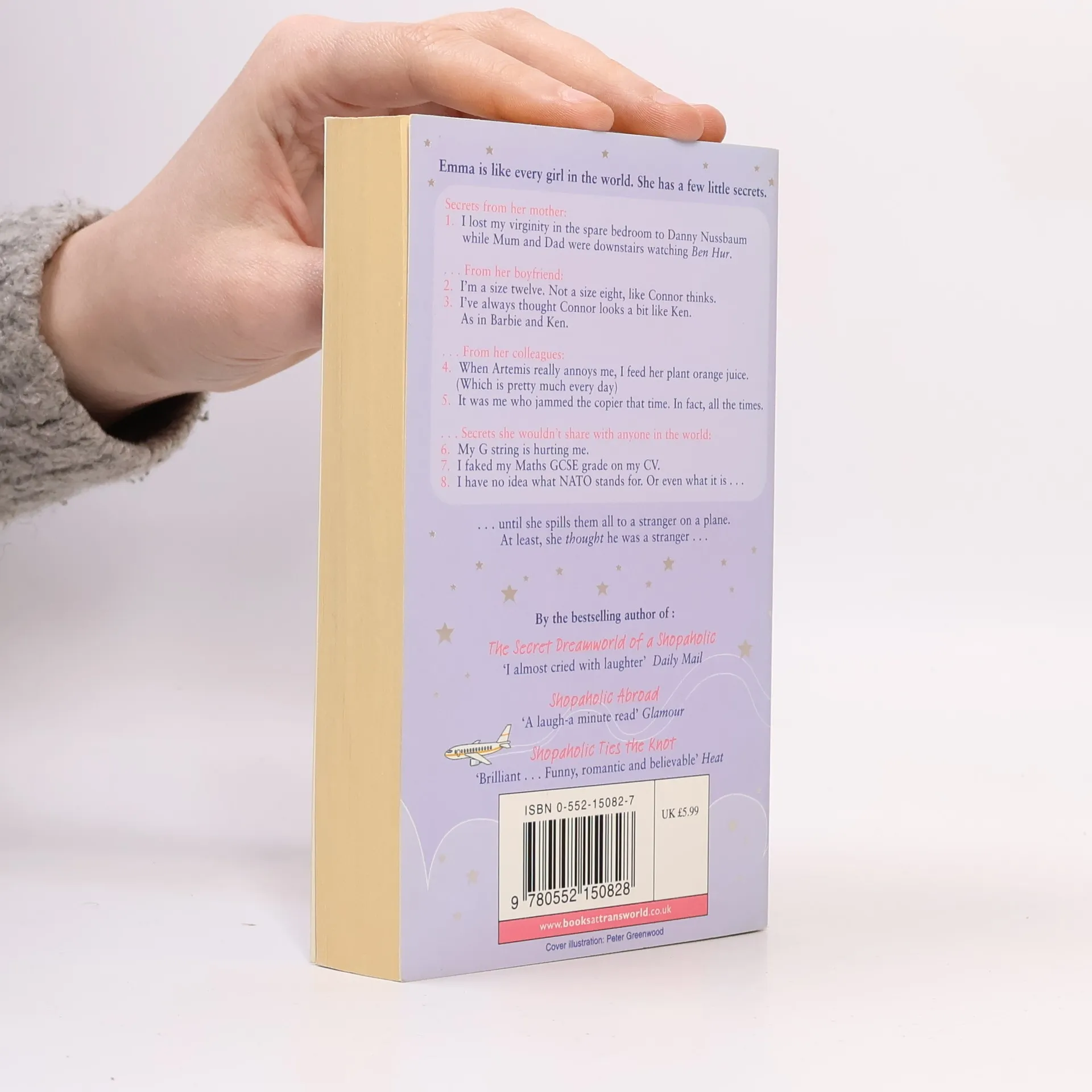Emma is like every girl in the world. She has a few little secrets. I lost my virginity in the spare bedroom to Danny Nussbaum while Mum and Dad were downstairs watching Ben Hur. I'm a size twelve. Not a size eight, like Connor thinks. I've always thought Connor looks a bit like Ken. As in Barbie and Ken. When Artemis really annoys me, I feed her plant orange juice. (Which is pretty much every day). It was me who jammed the copier that time. In fart, all the times. My G string is hurting me. I faked my Maths GCSE grade on my CV. I have no idea what NATO stands for. Or even what it is... ... until she spills them all to a stranger on a plane. At least, she thought he was a stranger...