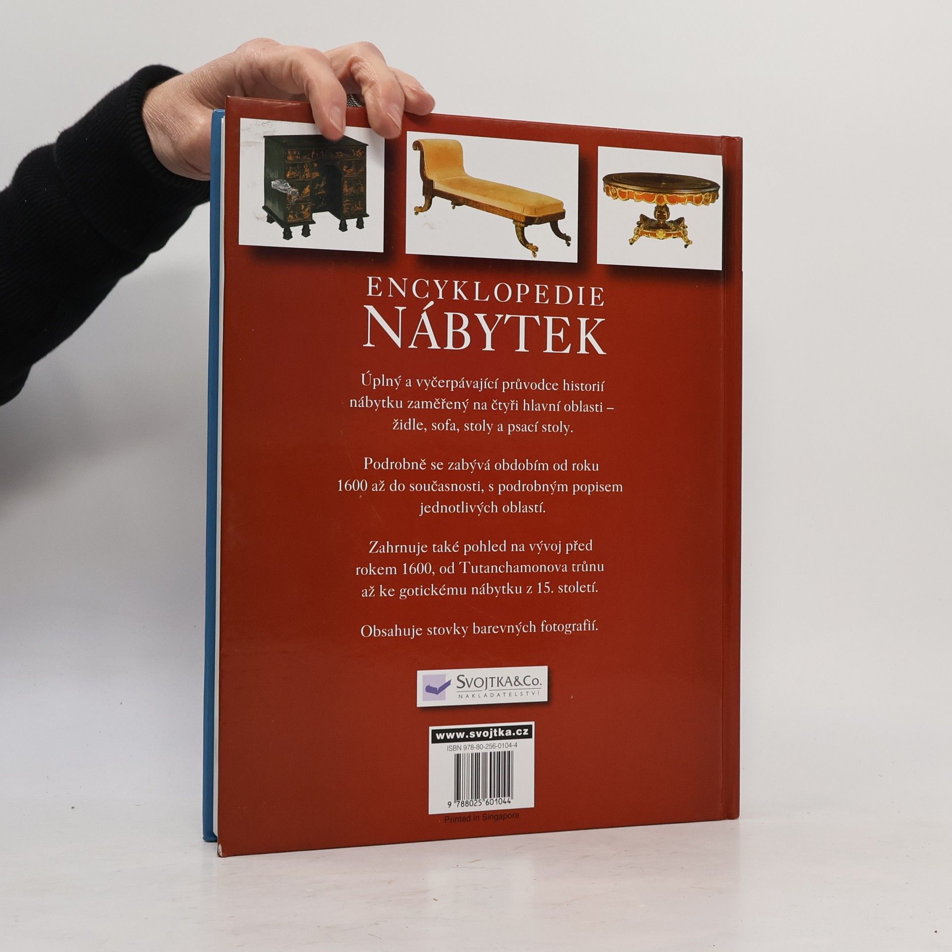 Jeden z důvodů zájmu o sběratelství starého nábytku určitě spočívá v historii, která se vyvíjela zároveň s rozvíjejícími se styly a ozdobnými motivy. Každý kus jednotlivého typu nábytku, který podrobně přibližuje tato encyklopedie, má z hlediska provedení své vlastní historické pozadí, které je obrazem módních trendů v době, kdy byl vyroben. Přesné zařazení jednotlivých kusů nábytku může být někdy vzhledem k množství působících podnětů a okolností obtížné. Tato kniha se pokusí stát se pro vás úplným a vyčerpávajícím průvodcem historií nábytku až do roku 1999. Naleznete v ní na stovku barevných fotografií a vysvětlujících poznámek, analýzy a rady od zkušených odborníků na starožitnosti