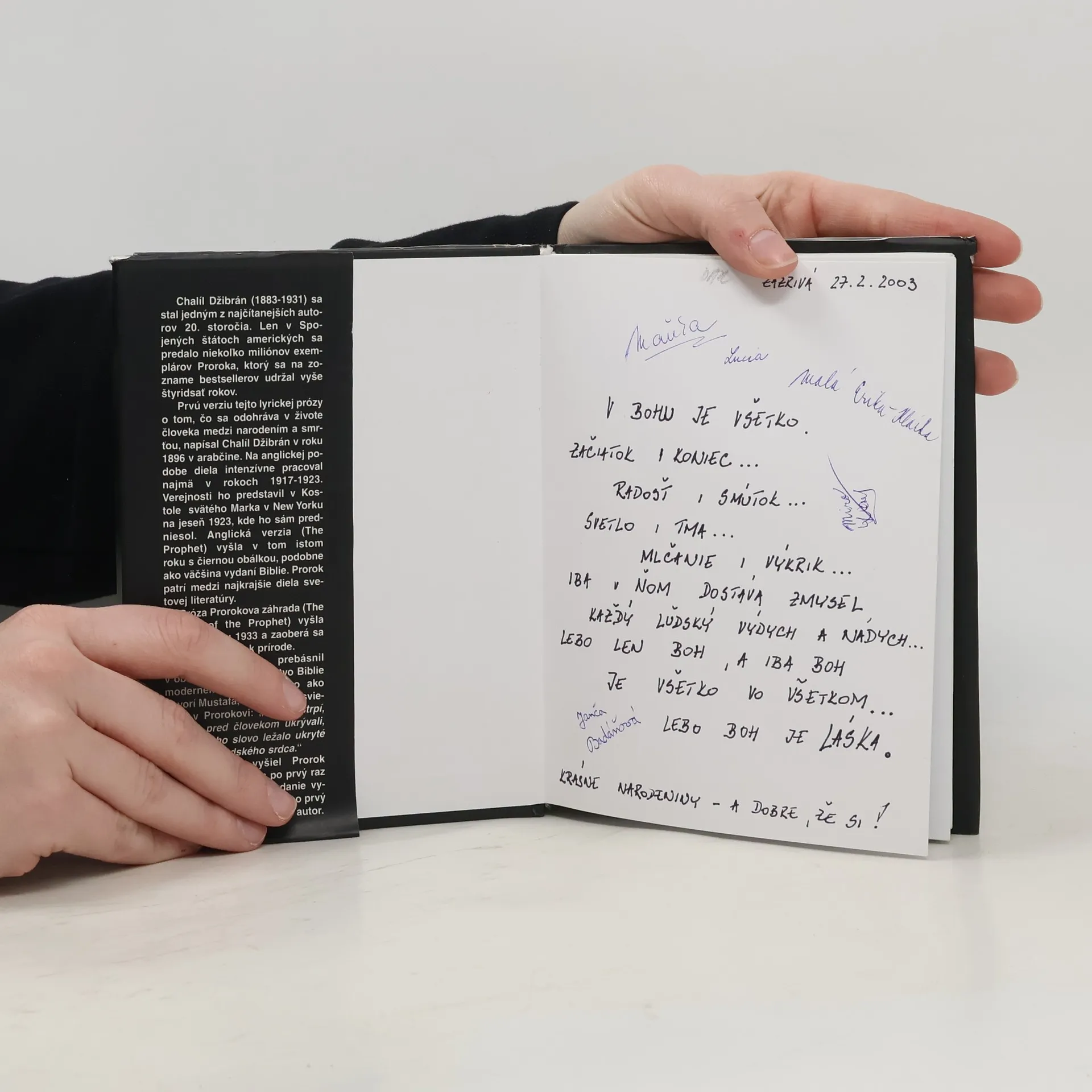 Lyrická próza Prorok (The Prophet) od Chalíla Džibrána je jedným z najpôvabnejších a najčítanejších klenotov svetovej literatúry. Anglická verzia uzrela svetlo sveta v jeseni 1923 v Kostole svätého Marka v New Yorku, kde ju autor sám predniesol. Súčasťou tohto vydania je aj Prorokova záhrada(The Garden of Prophet) z roku 1933. Autor majstrovsky prebásnil posolstvo Biblie modernému človeku, lebo ako hovorí Mustafa, vyvolený a osvietený v Prorokovi, „Boh nestrpí, aby bol pred človekom ukrytý, ani aby Jeho slovo ležalo ukryté v priepasti ľudského srdca.“